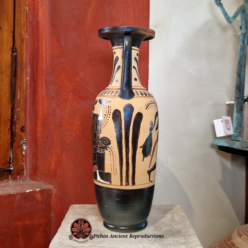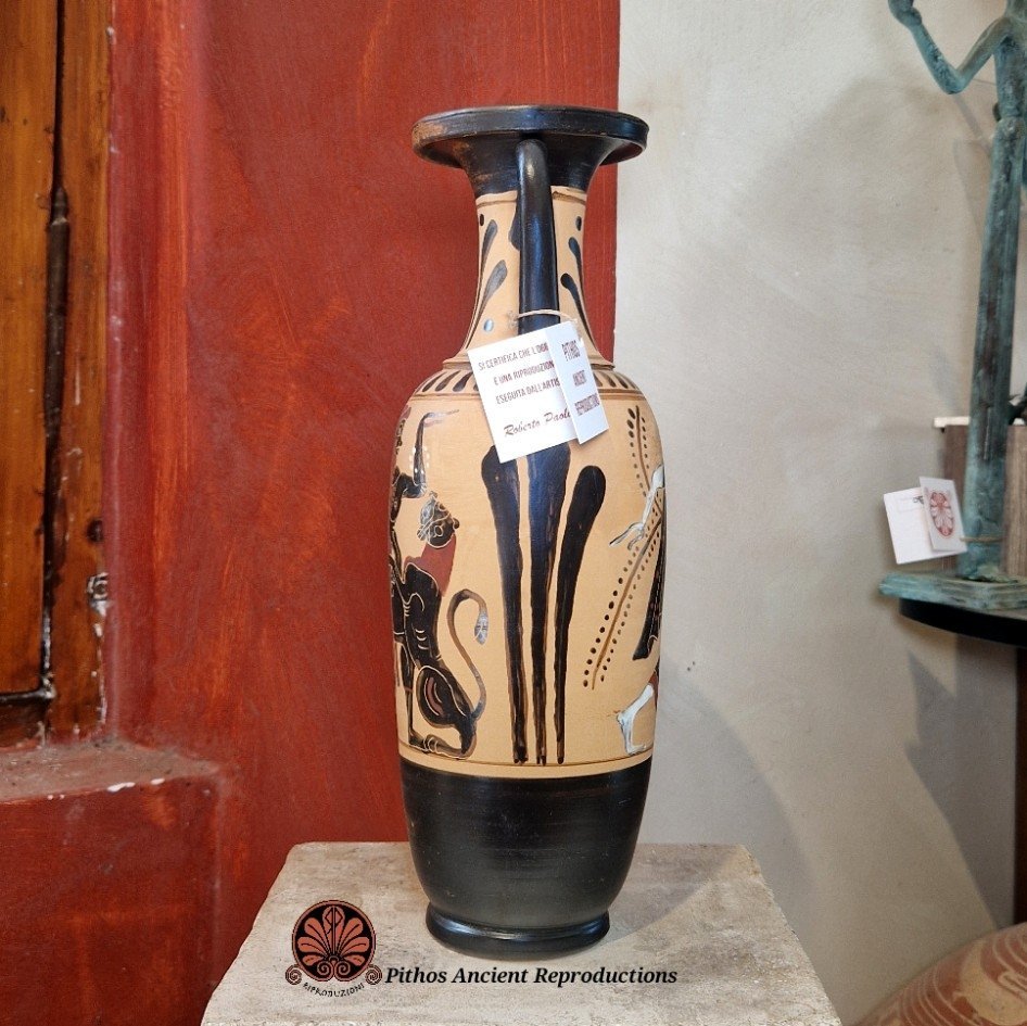 Anfora a figure nere. Ceramica smaltata all'interno per uso alimentare, mantenendo la tecnica antica nella parte esterna. Su un lato è raffigurato un satiro danzante con una pantera, sull'altro lato è raffigurata una menade che regge nella mano sinistra una patera. Sotto i manici e sul collo del vaso sono raffigurate decorazioni floreali. Prodotto artigianale realizzato interamente a mano. Opera d'arte unica.