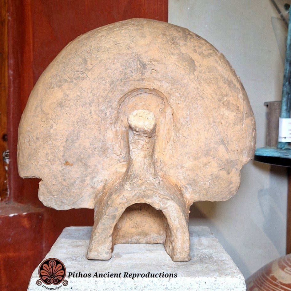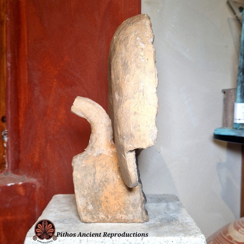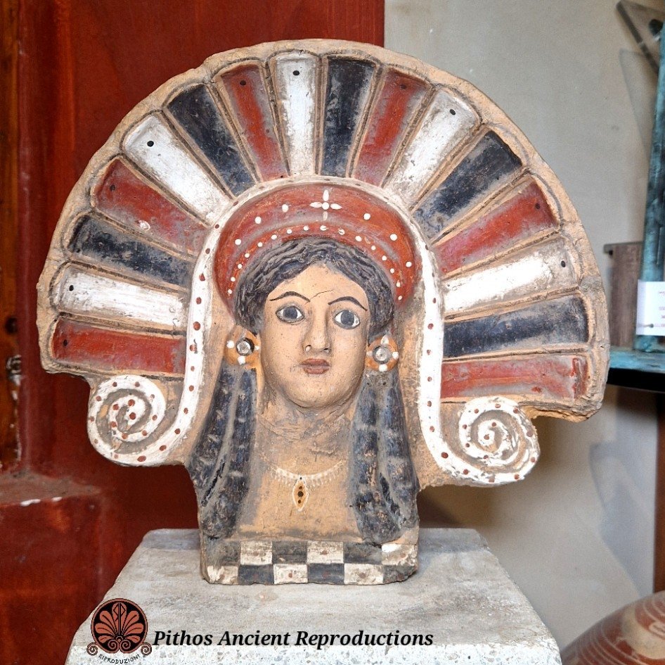 Antefissa etrusca in terracotta raffigurante il volto di una donna. Decorata nei minimi dettagli con reggera policroma. Anticamente veniva utilizzata per rivestire e decorare elementi architettonici, come soffitti, frontoni di templi e pareti, dipinte a colori vivaci. Realizzata con le stesse tecniche utilizzate anticamente.