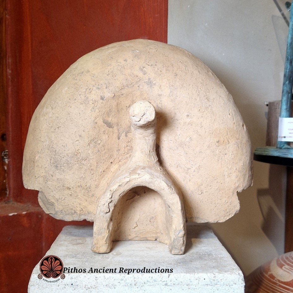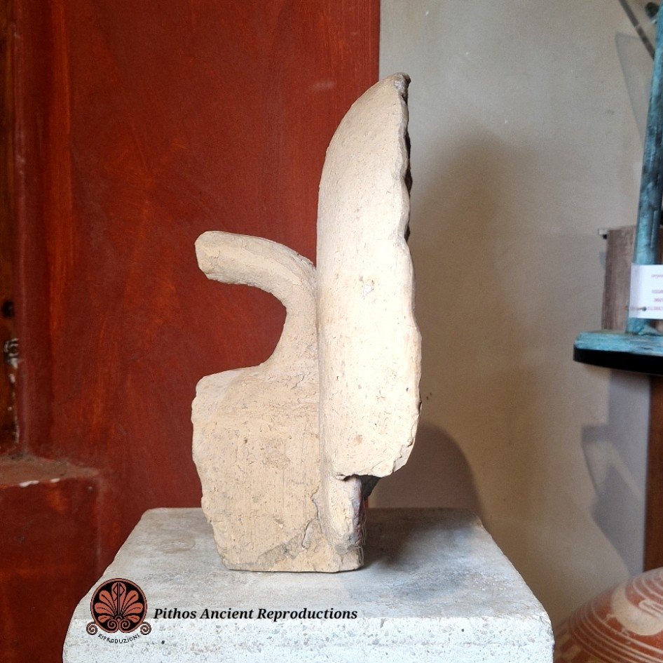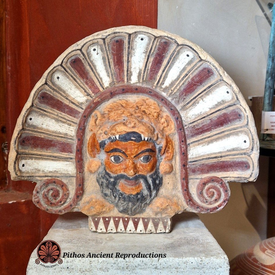 Antefissa etrusca in terracotta raffigurante un satiro che indossa la pelliccia di leone, con raggera policroma. Decorata nei minimi dettagli. Anticamente veniva utilizzata per rivestire e decorare elementi architettonici, come soffitti, frontoni di templi e pareti. Realizzata con le stesse tecniche utilizzate anticamente.