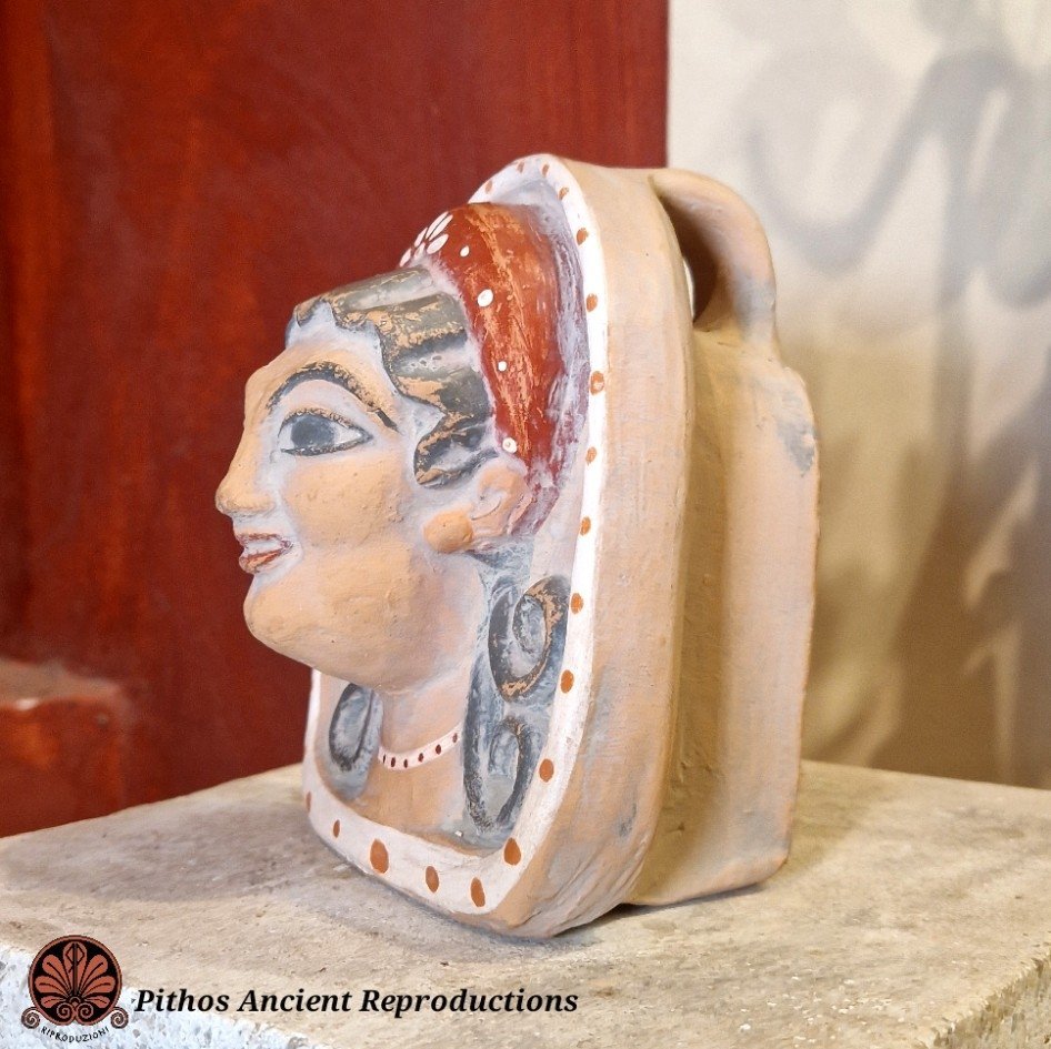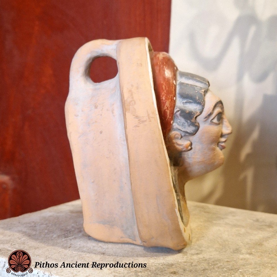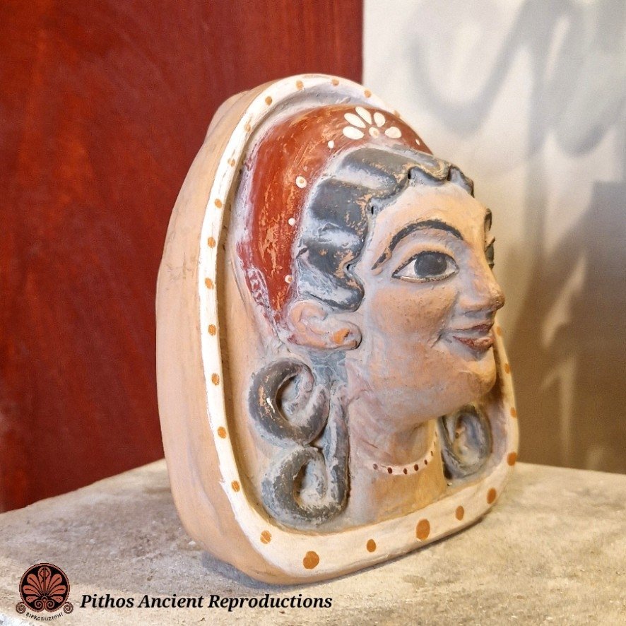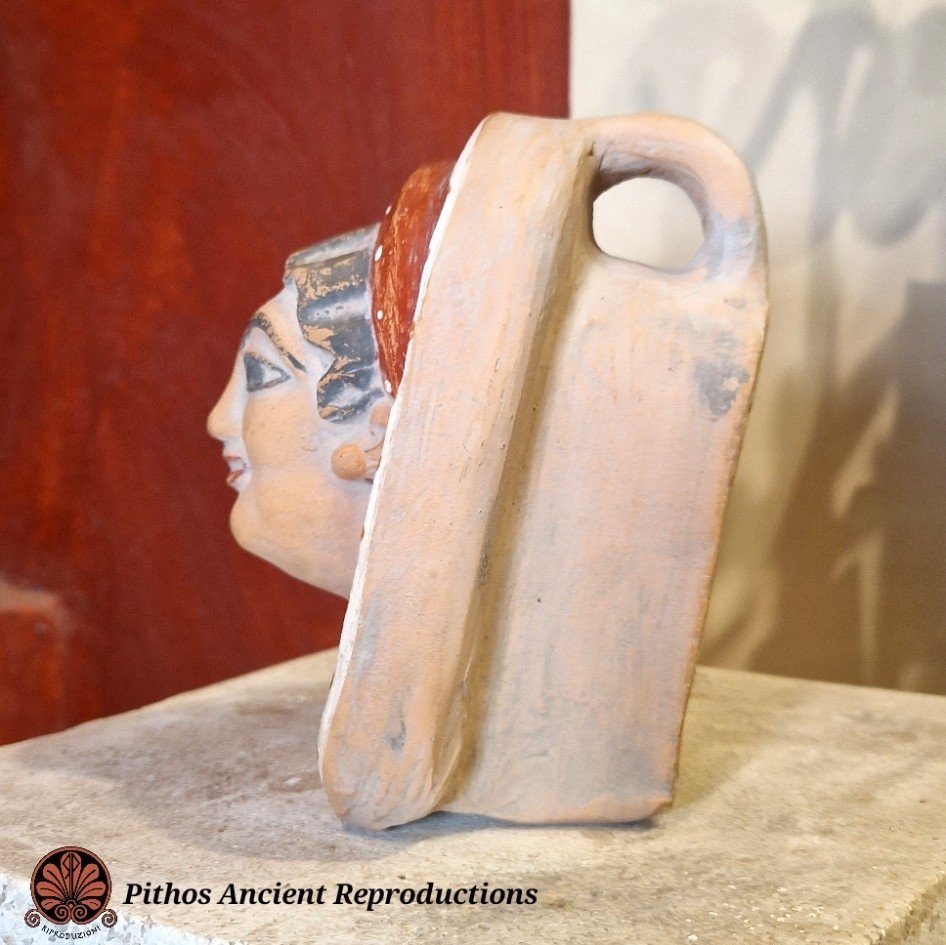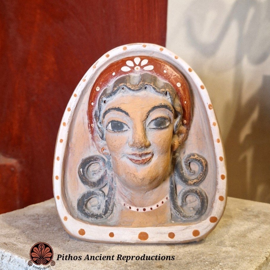 Antefissa etrusca in terracotta raffigurante il volto di una donna. Decorata nei minimi dettagli, con sovradipinture in rosso e bianco. Realizzata con le stesse tecniche utilizzate anticamente.