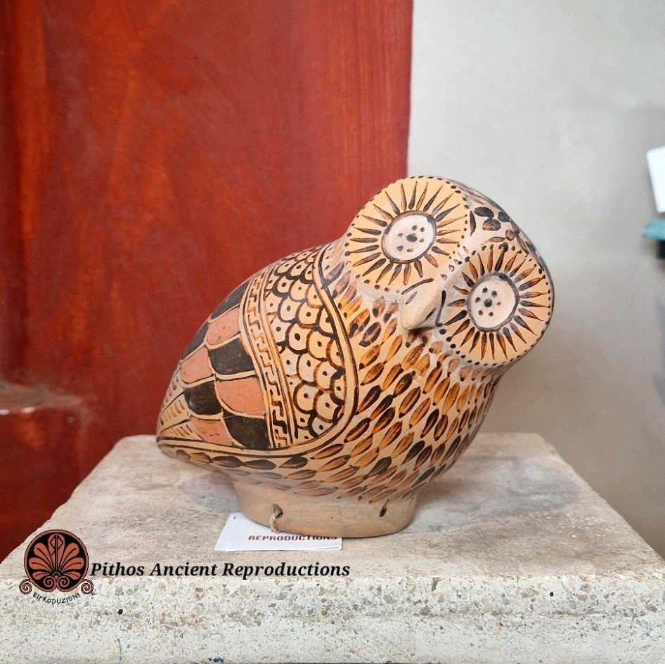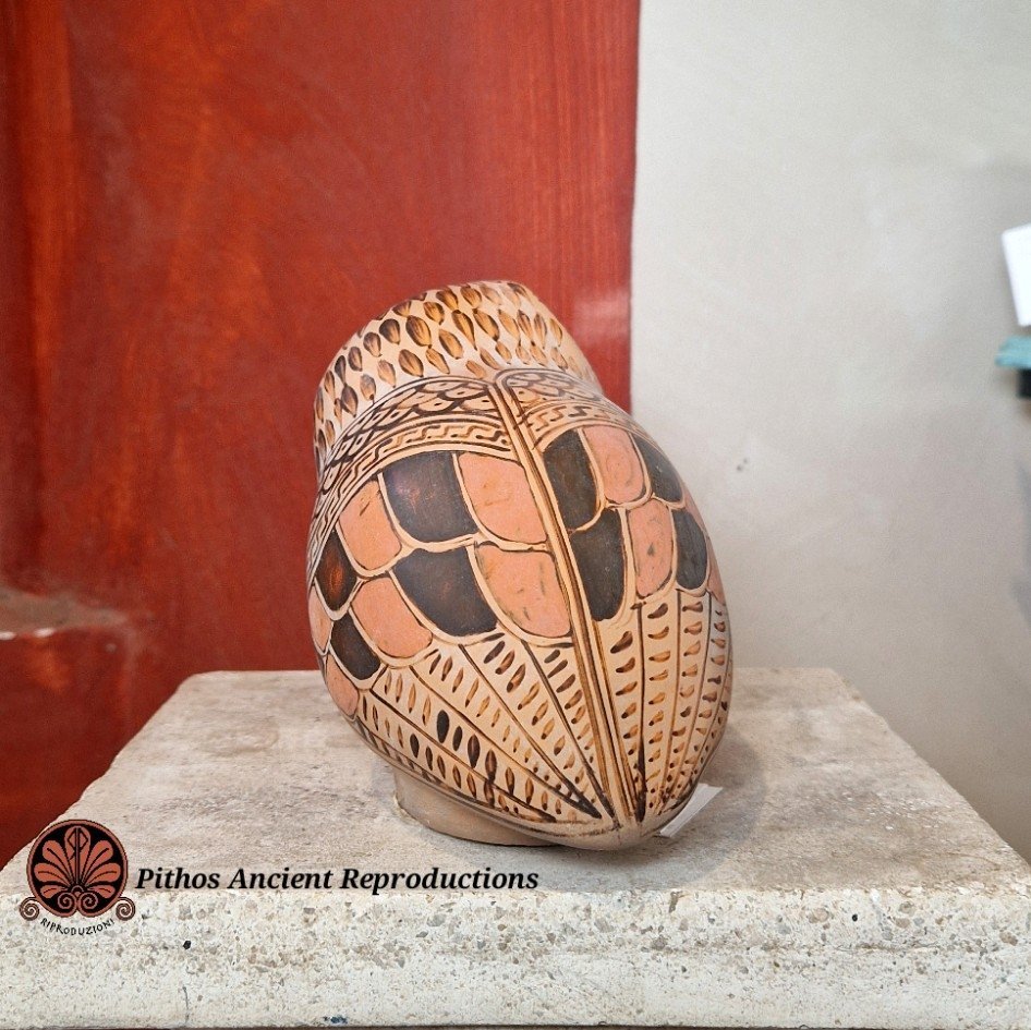 Aryballos a forma di Civetta. Decorato con piumaggio e sovradipinture in bordeaux. Realizzato con le stesse tecniche antiche, materie prime e cottura in riduzione di ossigeno. Anticamente veniva utilizzato per contenere unguenti.