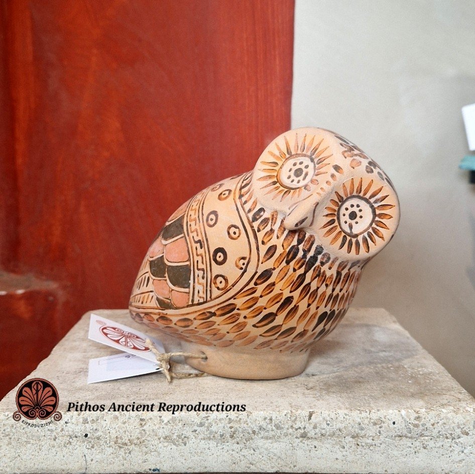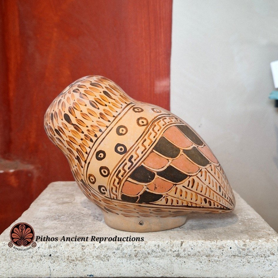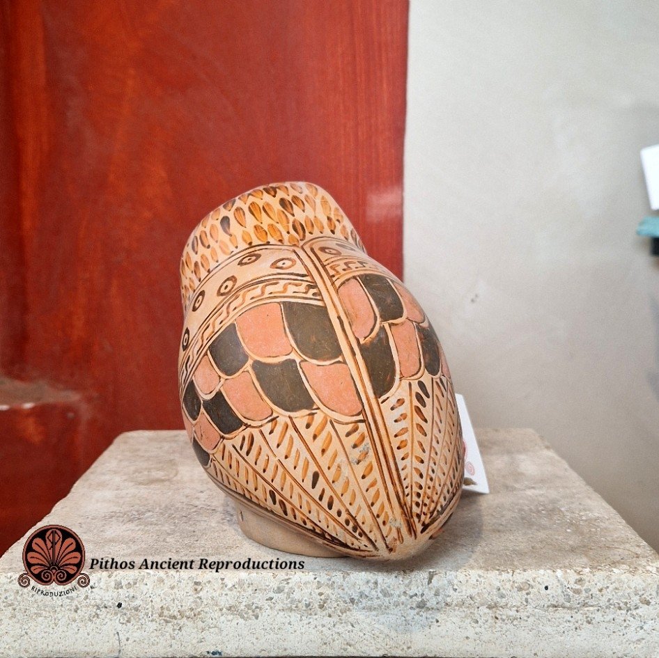 Aryballos a forma di Civetta. Decorato con piumaggio e sovradipinture in bordeaux. Realizzato con le stesse tecniche utilizzate anticamente, materie prime e cottura in riduzione di ossigeno. Anticamente veniva utilizzato come porta unguenti.