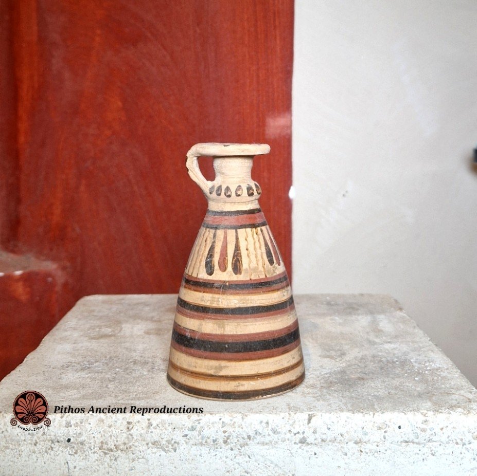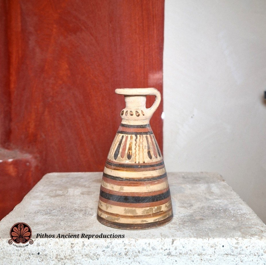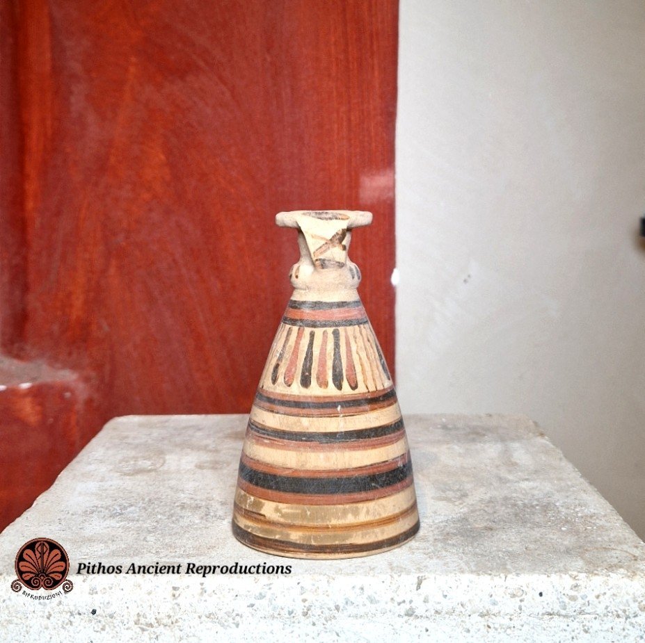 Aryballos etrusco corinzio a figure nere. Raffigurante tipiche decorazioni etrusco corinzie. Realizzato con le stesse tecniche antiche e cottura in riduzione di ossigeno.