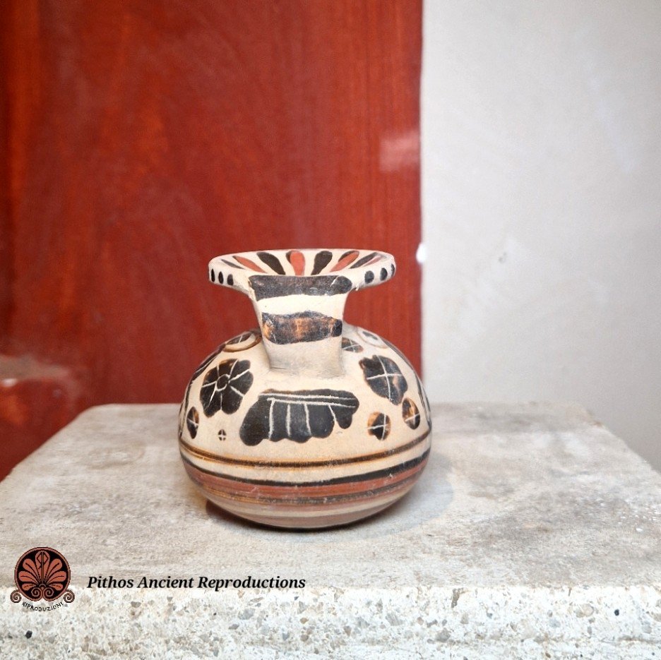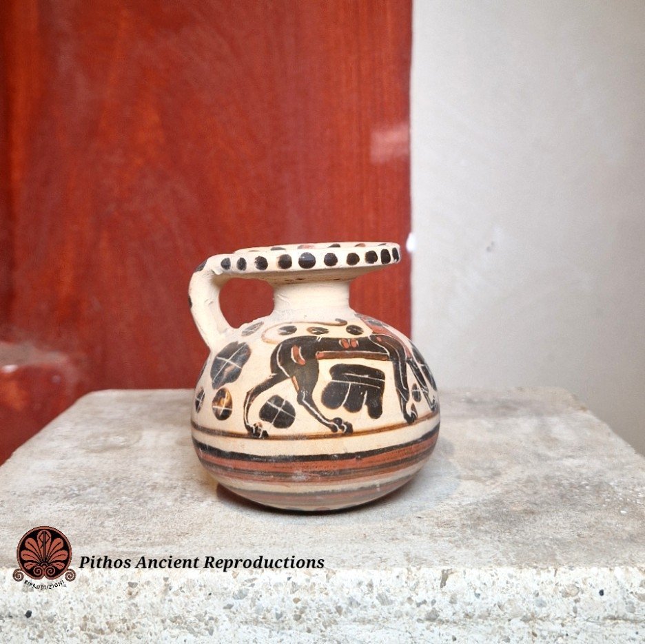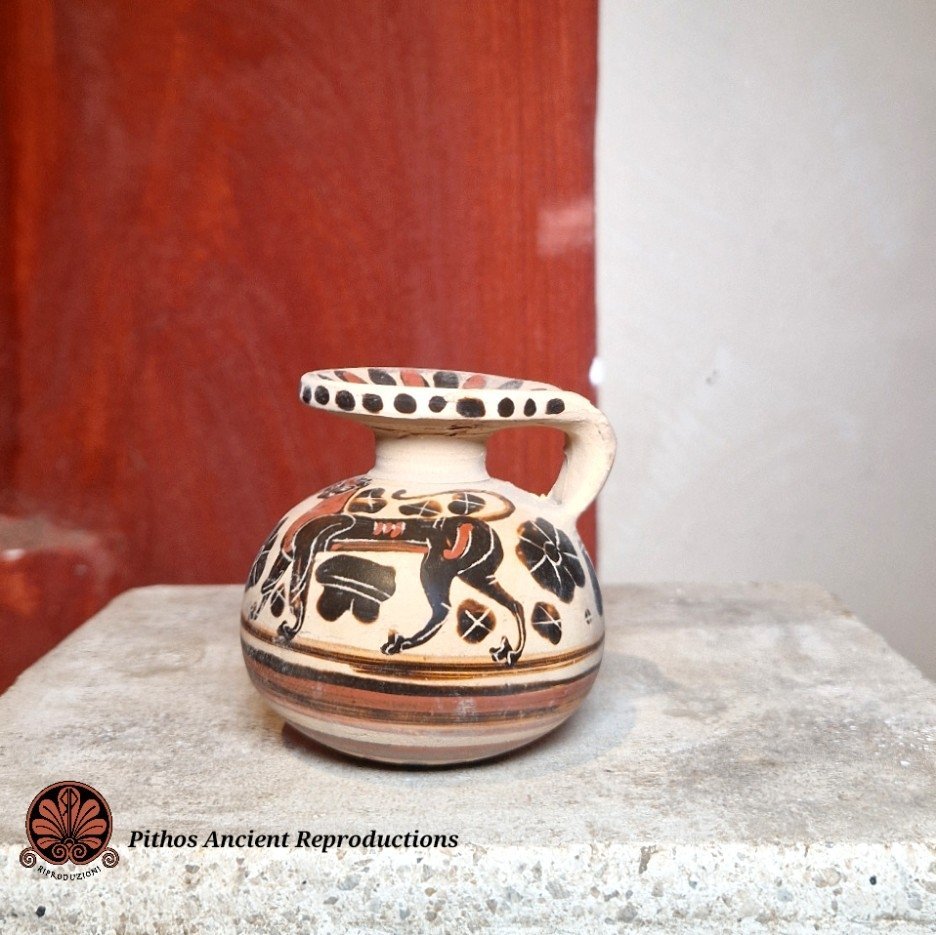 Aryballos etrusco corinzio a figure nere. Raffigurante due pantere al centro della pancia, unite da un unico volto. Tra loro tipiche decorazioni a rosetta. Anticamente veniva utilizzato per contenere olii profumati (unguenti) per l' igiene personale e sportiva. Realizzato con tecniche antiche e cottura in riduzione di ossigeno.