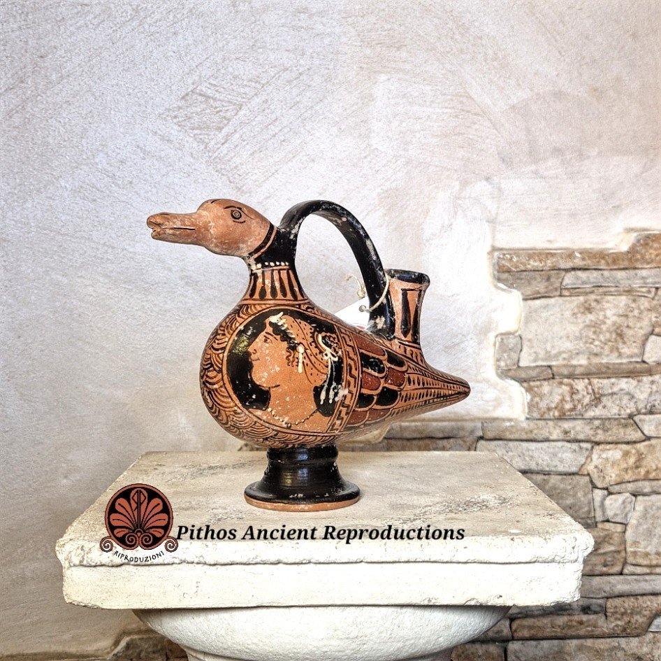 Riproduzione askos a forma di papera. Decorata su un lato con Erote, dio e potenza divina del desiderio sessuale e dell' amore divino. Sull' altro lato è raffigurato il profilo di una giovane donna, con capelli raccolti in un kekryphalos, un orecchino ed una collana. Il resto del corpo del vaso è decorato con piumaggio ed un tipico meandro. Sovradipinture in bianco e bordeaux. Anticamente veniva utilizzato per versare piccole quantità di liquidi oleosi, utilizzato come unguentario. Realizzato con le stesse tecniche utilizzate anticamente, dalla pittura alla cottura in riduzione di ossigeno.