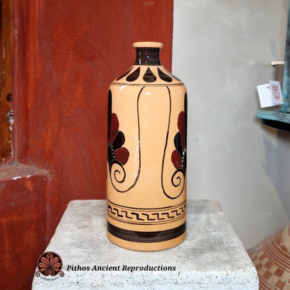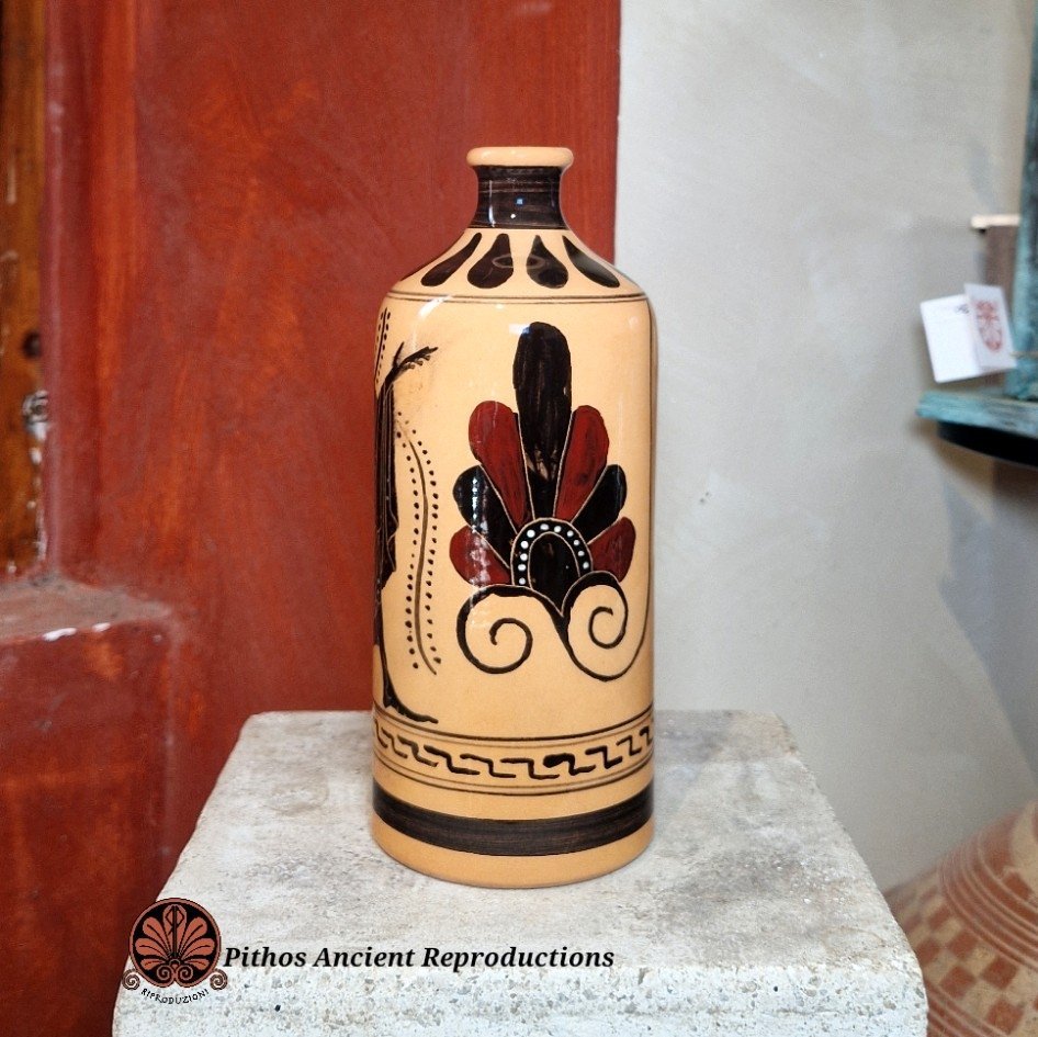Bottiglia moderna smaltata con decorazioni antiche a figure nere. Raffigurante Dioniso che regge in mano il suo corno. Ai lati della figura sono raffigurate due decorazioni floreali a palmetta. Ceramica artigianale realizzata interamente a mano, smaltata per uso alimentare. Opera d'arte unica.