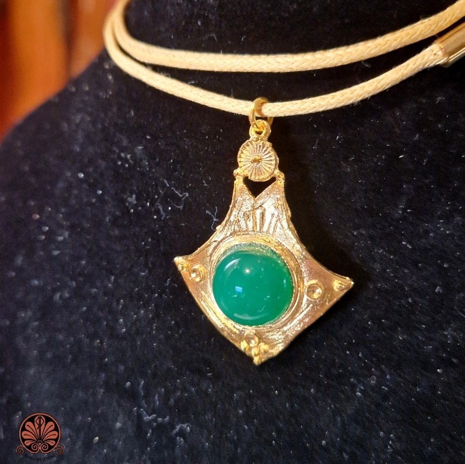 Collana ciondolo artigianale in stile antico con pietra agata verde incastonata. Lavorazione tipica etrusca. Ogni gioiello artigianale è un pezzo unico creato con cura e amore. Nichel free.