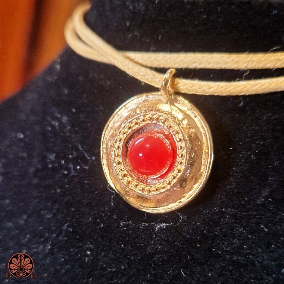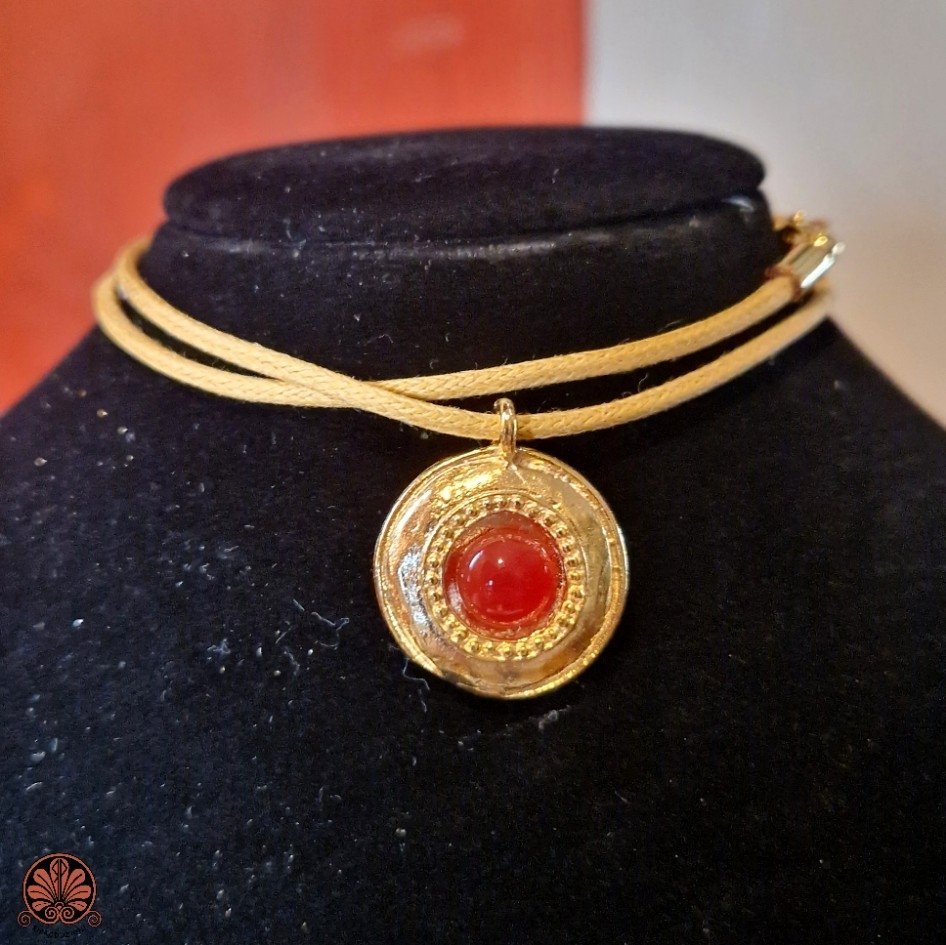 Collana ciondolo artigianale in stile antico con pietra corniola. Lavorazione granulata intorno alla pietra. Ogni gioiello artigianale è un pezzo unico creato con cura e amore. Nichel free.