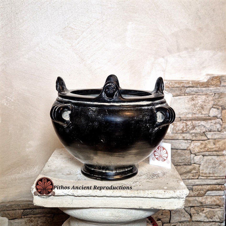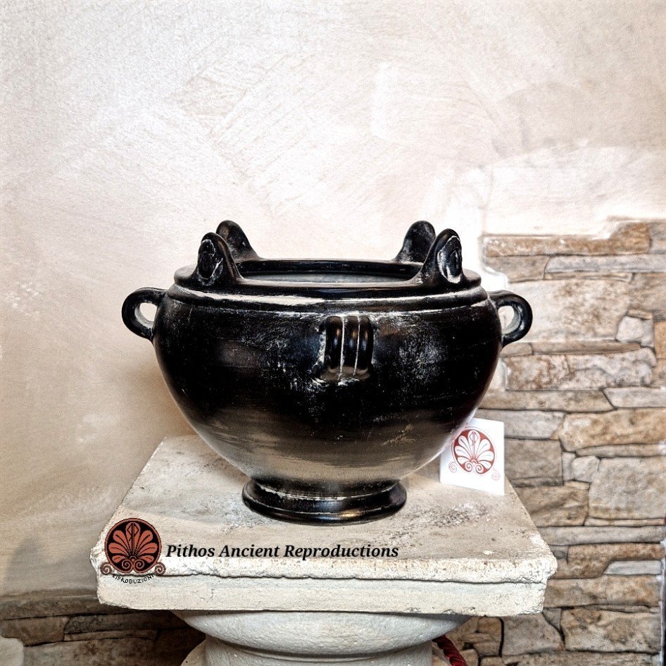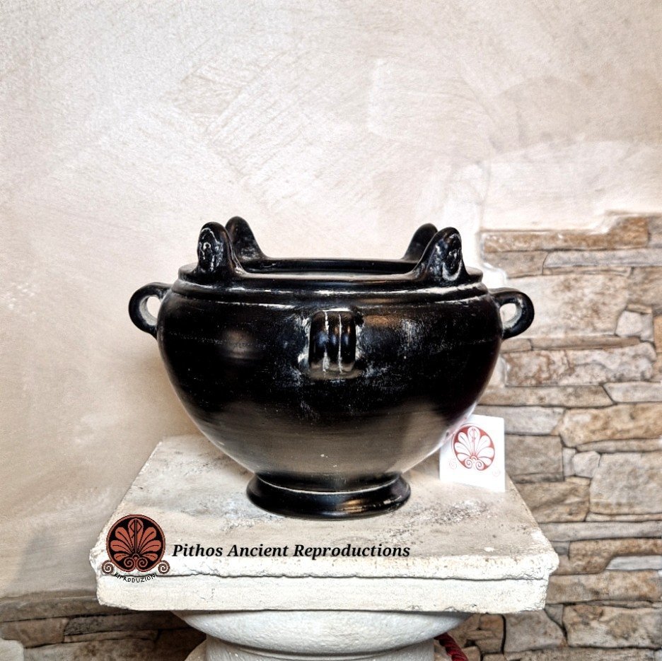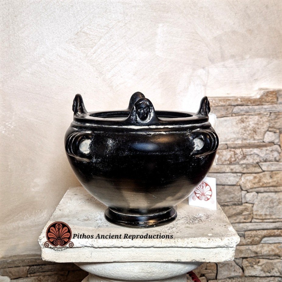 Coppa biansata etrusca in bucchero. Decorata sul bordo della vasca con quattro volti a rilievo. Realizzata con le stesse tecniche utilizzate anticamente. Il colore nero è dato da una particolare tecnica di cottura in totale assenza di ossigeno.