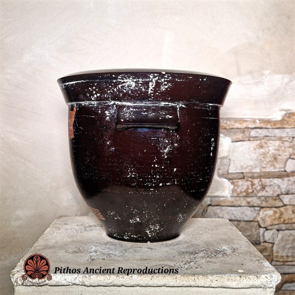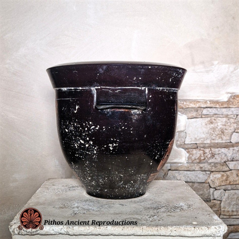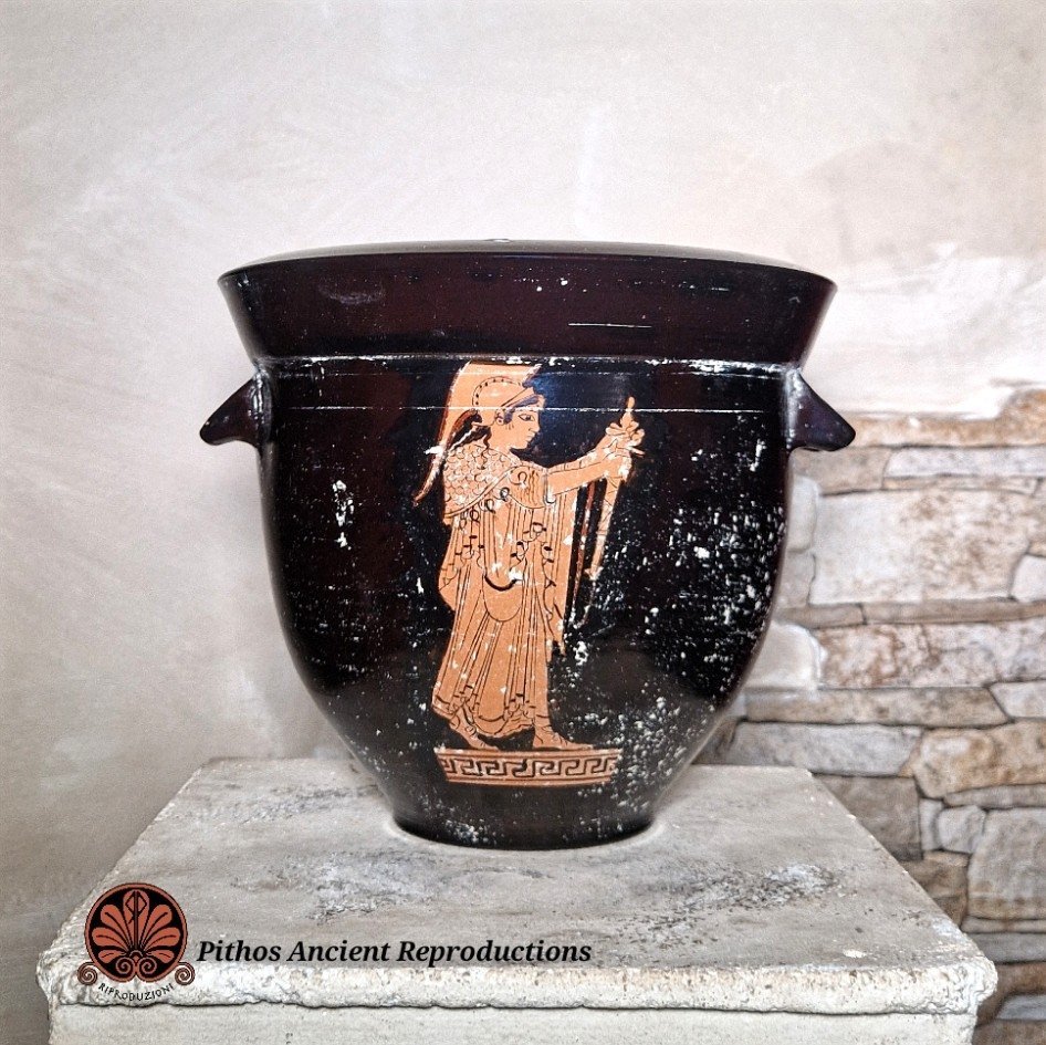 Vaso Cratere attico a campana a figure rosse. Raffigurante su un lato la Dea Atena mentre regge tra le mani la sua spada (dea della saggezza, della strategia e della giustizia). Il personaggio poggia su di un meandro tipico. Sull' altro lato è raffigurato Aiace mentre si prepara per la battaglia. Il personaggio poggia su di un tipico meandro. Realizzato con le stesse tecniche utilizzate anticamente, dalla cottura alla pittura in riduzione di ossigeno.