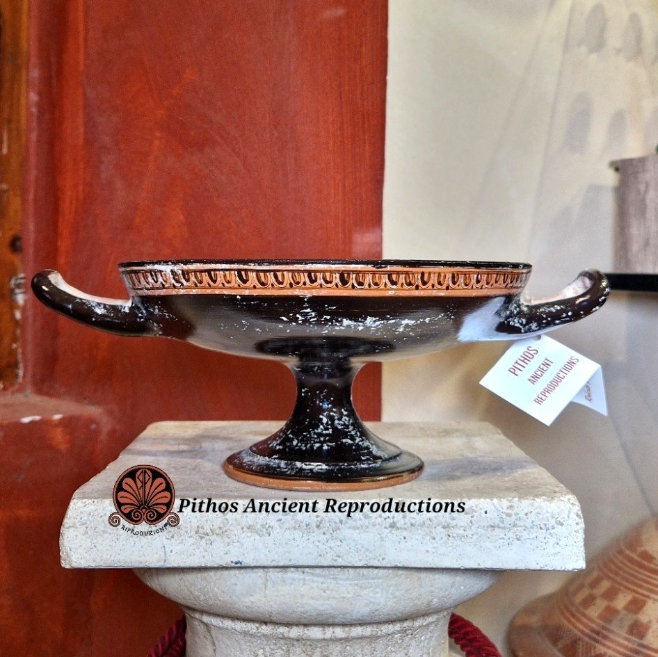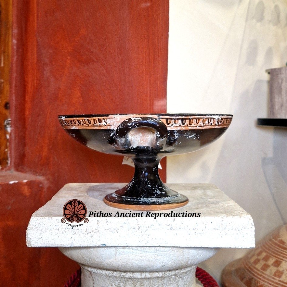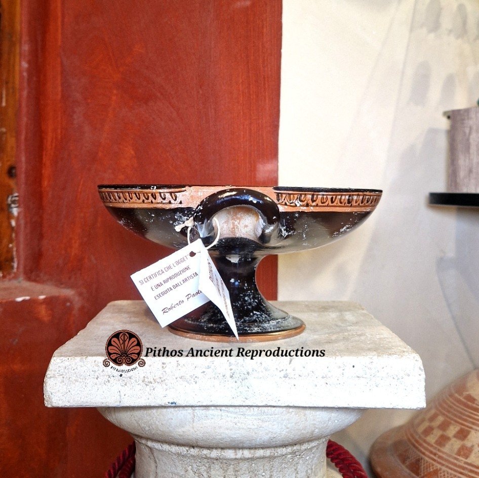 Vaso Kylix a figure rosse. Decorata nella vasca interna con una Gorgone ed un meandro tipico che gira tutto intorno al volto. Questa forma di vaso veniva utilizzata come coppa da vino nei simposi e soprattutto per il gioco del kottabos. Realizzata con le stesse tecniche utilizzate anticamente, dipinta a baffo di lepre e cotta in riduzione di ossigeno. Opera d’arte unica.