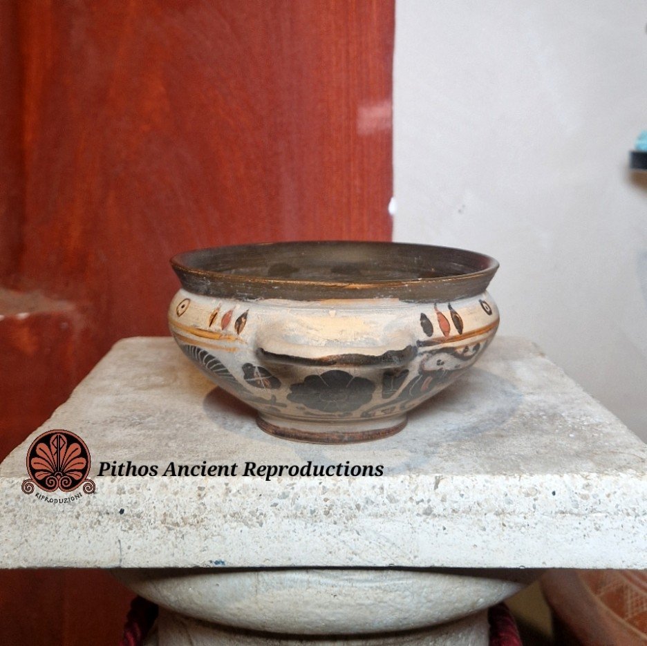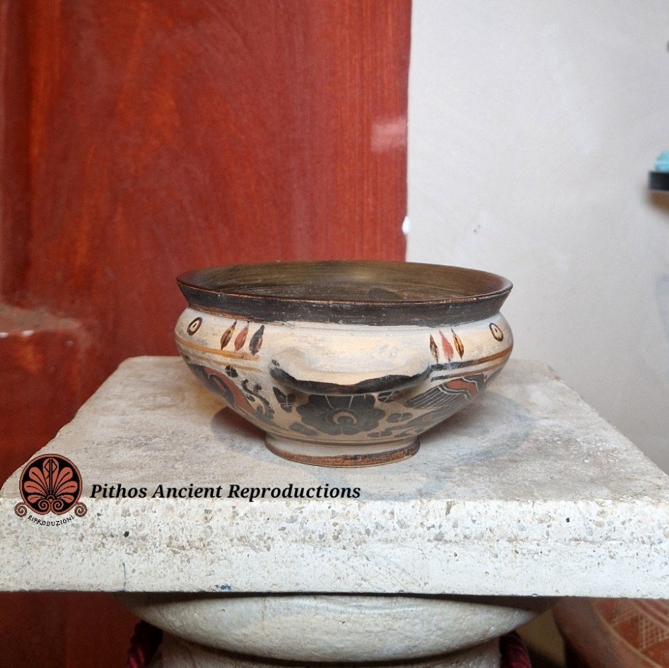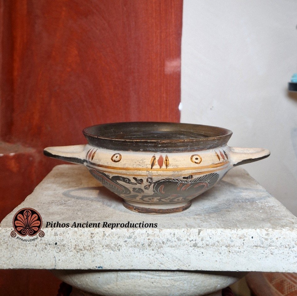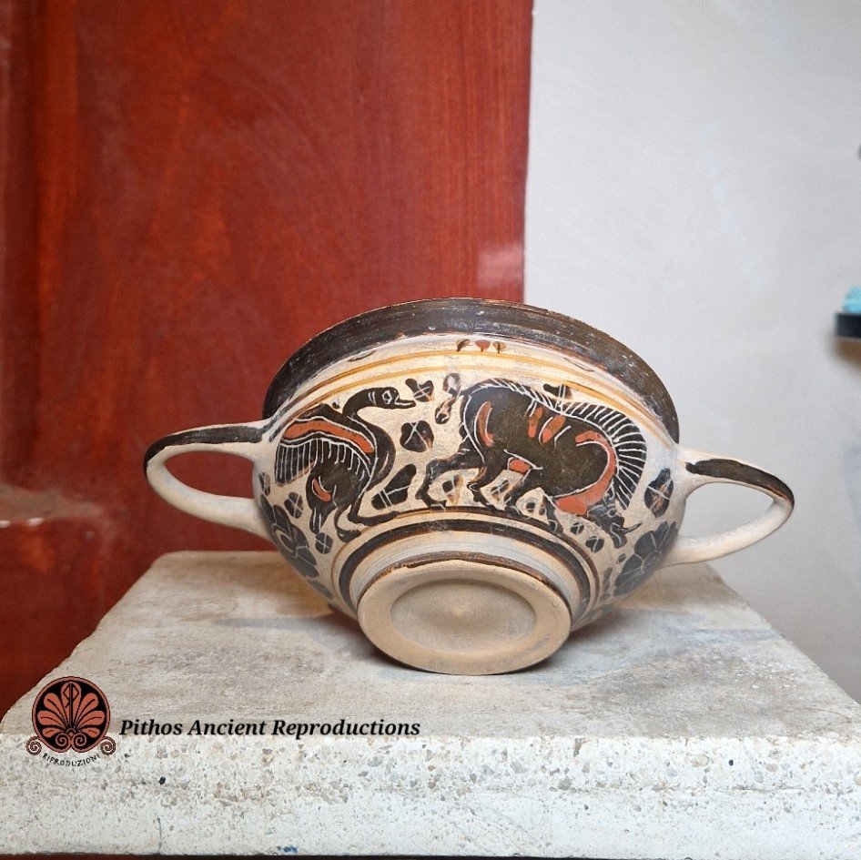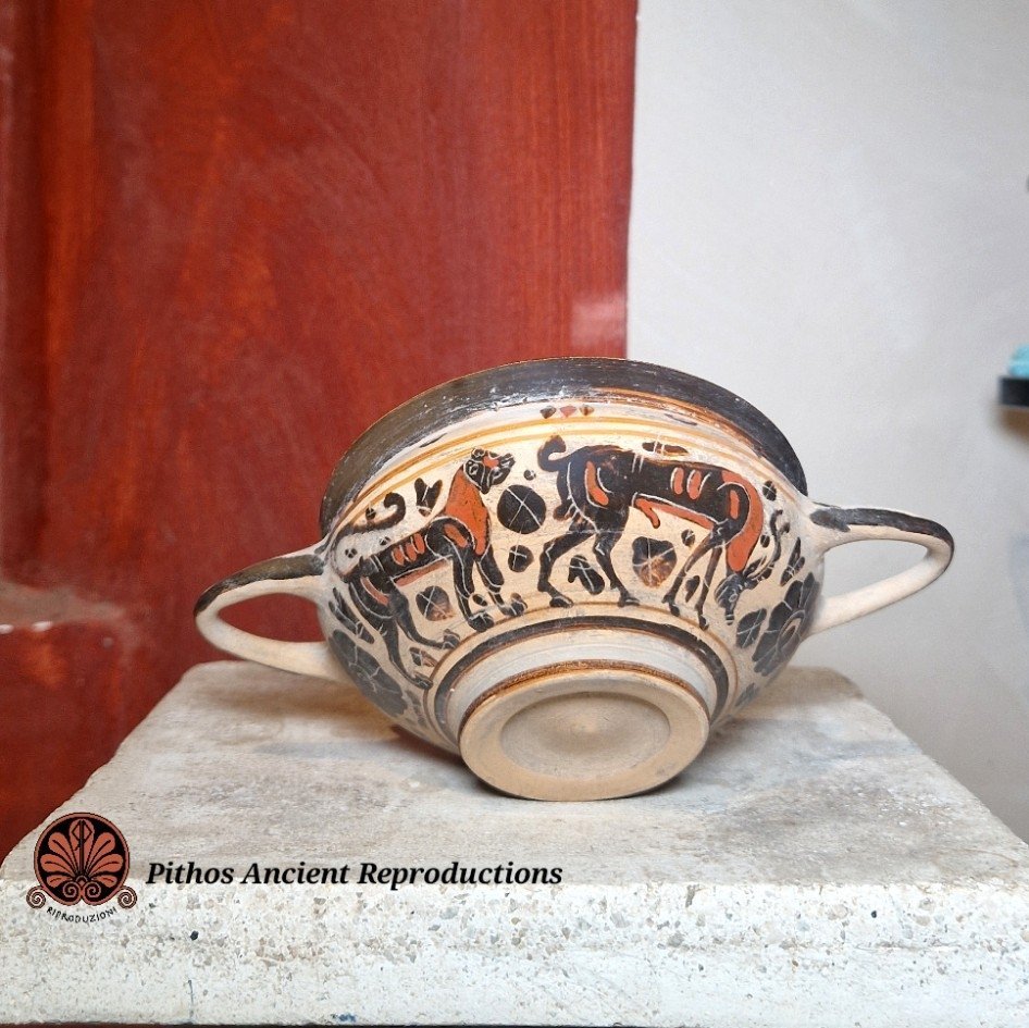 Vaso Kylix Corinzio a figure nere. Decorata con una scena di animali che girano tutte intorno al vaso. Realizzata con tecniche antiche e vernici naturali cotte in riduzione di ossigeno.