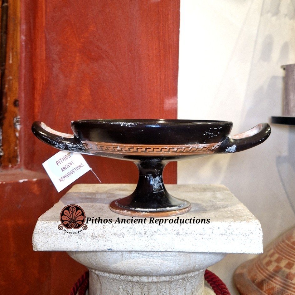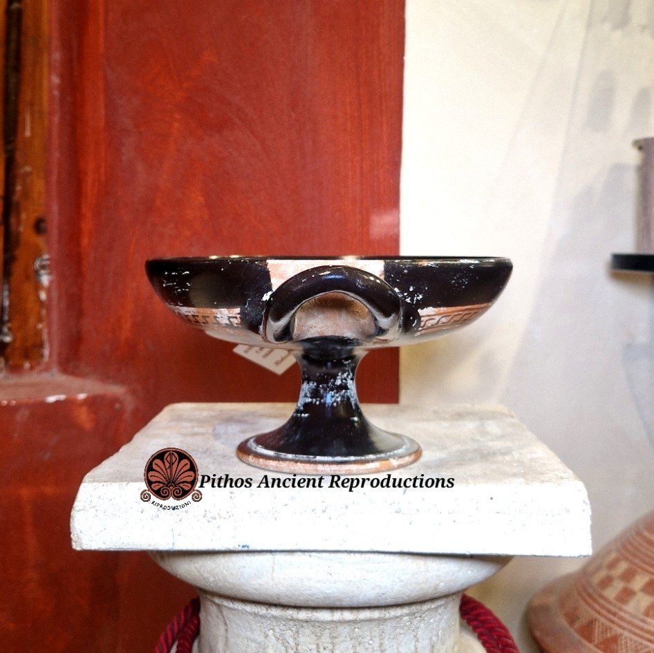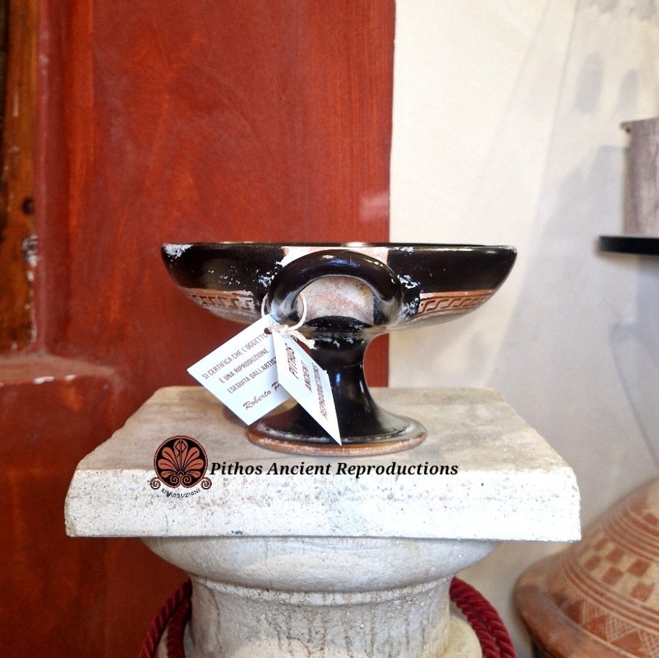 Vaso Kylix a figure rosse. Raffigurante la terza fatica di Ercole al centro della vasca. Consisteva nella cattura della Cerva di Cerinea, un animale prodigioso dalle corna d'oro e zoccoli di bronzo, sacro alla Dea Artemide. Era estremamente veloce e intoccabile, simbolo di natura divina incontaminata. Ercole non potendola uccidere, riuscì a prenderla viva ferendola alle zampe con una freccia, portandola a Micene dimostrando forza e rispetto divino. Questa forma di vaso veniva utilizzata come coppa da vino nei simposi ed importante nel gioco del kottabos. Realizzata con le stesse tecniche utilizzate anticamente, dalla pittura alla cottura in riduzione di ossigeno. Dipinta a baffo di lepre. Opera d’arte unica.