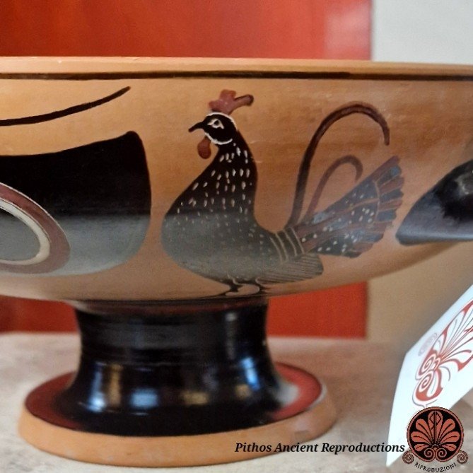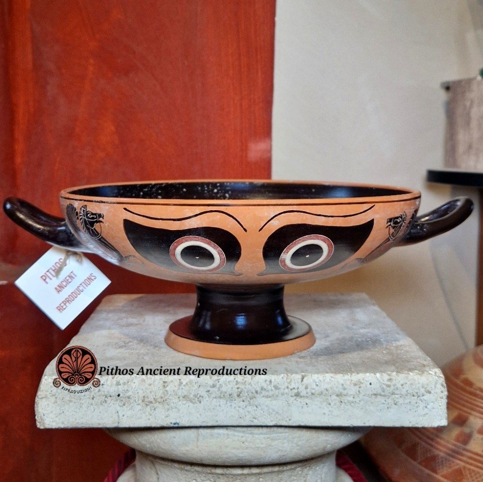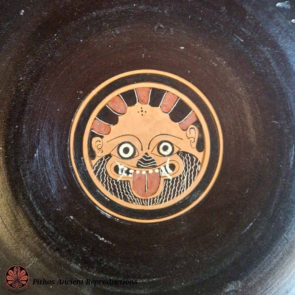 Vaso Kylix a figure rosse. Raffigurante una Gorgone (Medusa) al centro della vasca. Divinità della mitologia greca e sorella di Steno e Euriale, la quale era capace di impietrire chi la guardasse. Nella parte esterna della vasca sono raffigurati quattro occhi apotropaici su entrambi i lati, affiancati su un lato da due cavalli alati e sull' altro lato da due galli. Questa forma di vaso veniva utilizzata come coppa da vino nei simposi. Realizzata con le stesse tecniche utilizzate anticamente, dalla pittura alla cottura in riduzione di ossigeno. Opera d’arte unica.