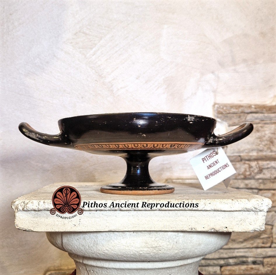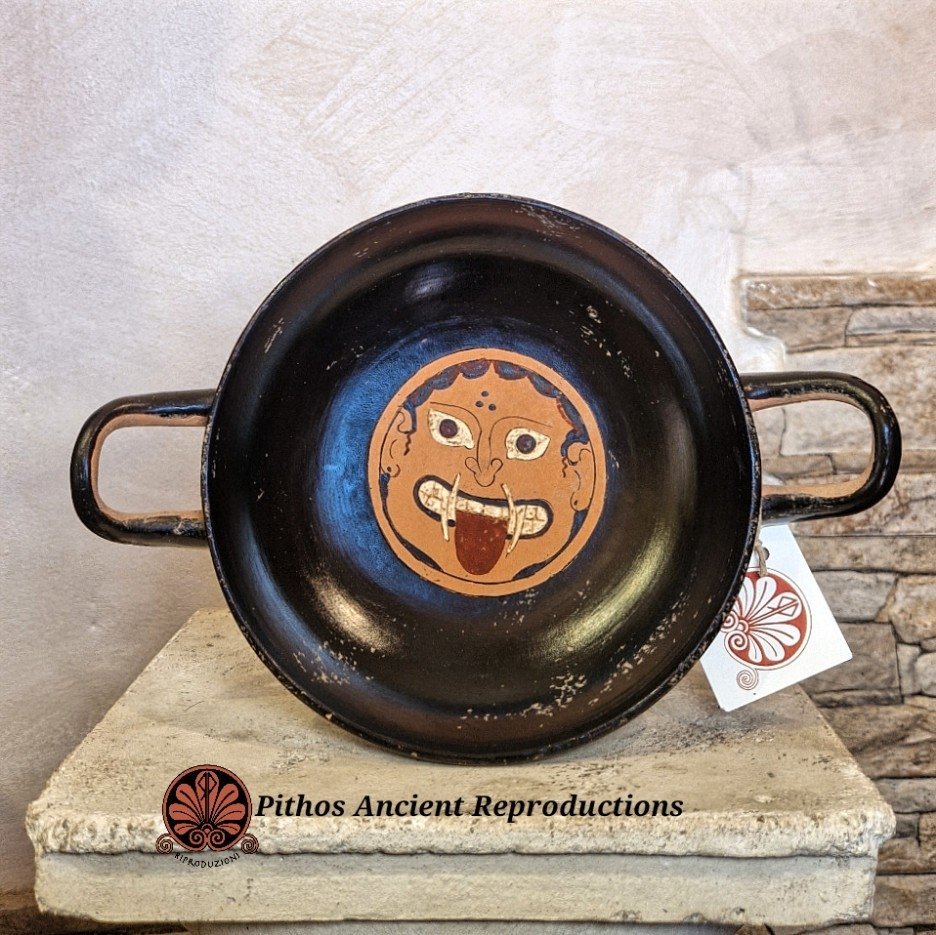 Vaso Kylix a figure rosse. Decorata nella vasca interna con una Gorgone e nella parte esterna della vasca è raffigurato un meandro tipico che gira tutto intorno al vaso. Realizzata con le stesse tecniche utilizzate anticamente, dipinta a baffo di lepre e cotta in riduzione di ossigeno.