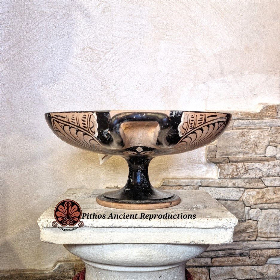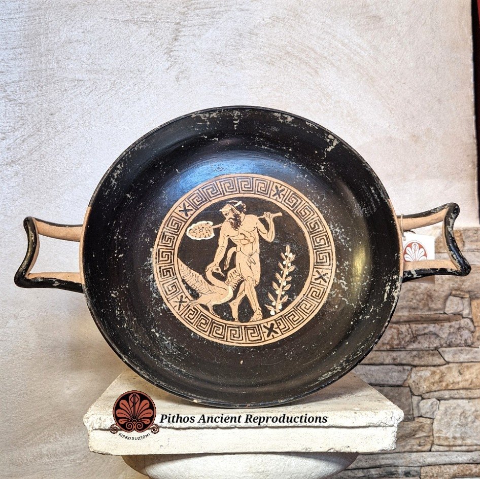Vaso Kylix a figure rosse. Decorata nella vasca interna con un Satiro mentre accarezza un cigno, davanti a loro una decorazione con ramo di olivo. La scena è racchiusa in un tipico meandro. Nella parte esterna della vasca, su un lato è raffigurata una donna, la quale indossa un chitone, un orecchino, regge nella mano sinistra un cotile e nella mano destra una pyxis. Ai suoi lati due decorazioni floreali a palmetta, sopra di esse due decorazioni floreali campanulate. Sull' altro lato è raffigurato un satiro, il quale stringe nella mano sinistra una lekanis e l' altra mano è poggiata su uno stylos. Ai suoi lati due decorazioni floreali a palmetta, sopra di esse due decorazioni floreali campanulate. Realizzata con le stesse tecniche utilizzate anticamente, dipinta a baffo di lepre e cotta in riduzione di ossigeno.