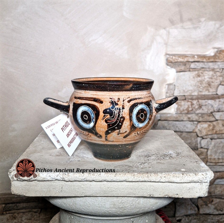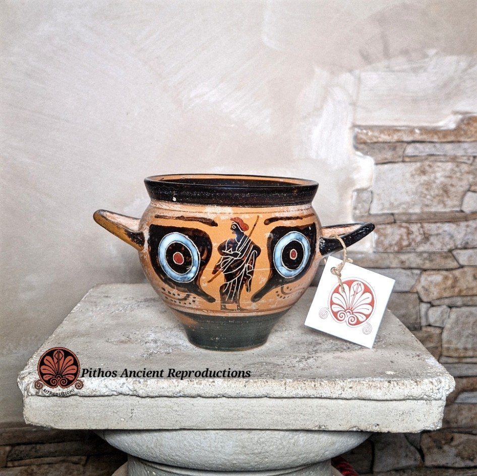 Vaso mastos, coppa a figure nere. Veniva utilizzato anticamente durante i simposi per bere. Raffigurante su entrambi i lati due occhi apotropaici, tra loro una menade danzante ed un uomo. Realizzato con le stesse tecniche utilizzate anticamente, dalla pittura alla cottura.