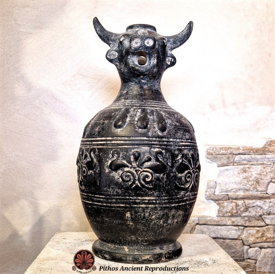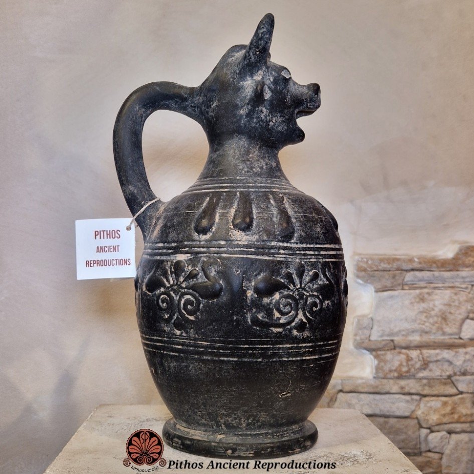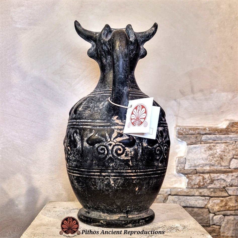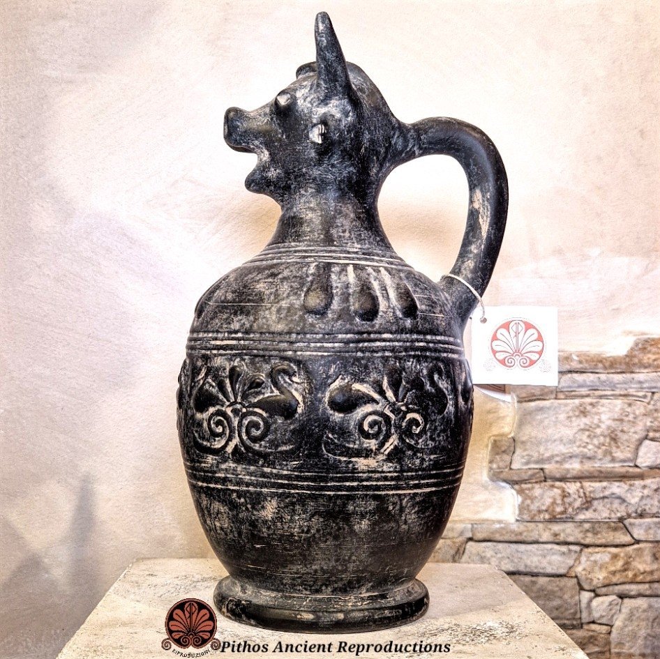Oinochoe in bucchero pesante di tipo Chiusino. Decorazione tipica a rilievo sulla pancia e sopra la spalla del vaso, la bocca è caratterizzata da una protome di toro. Ralizzata con le stesse tecniche utilizzate anticamente. Il colore nero è dato da una particolare tecnica di cottura, in totale assenza di ossigeno.