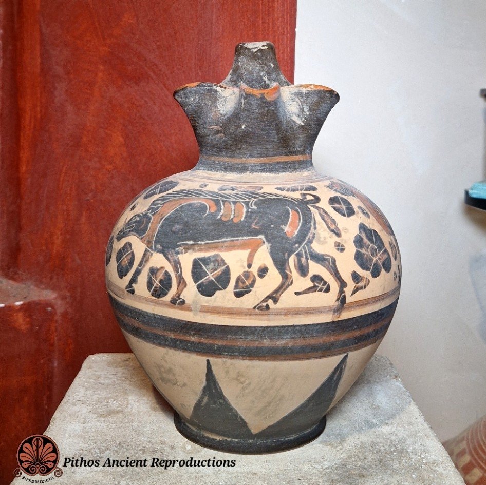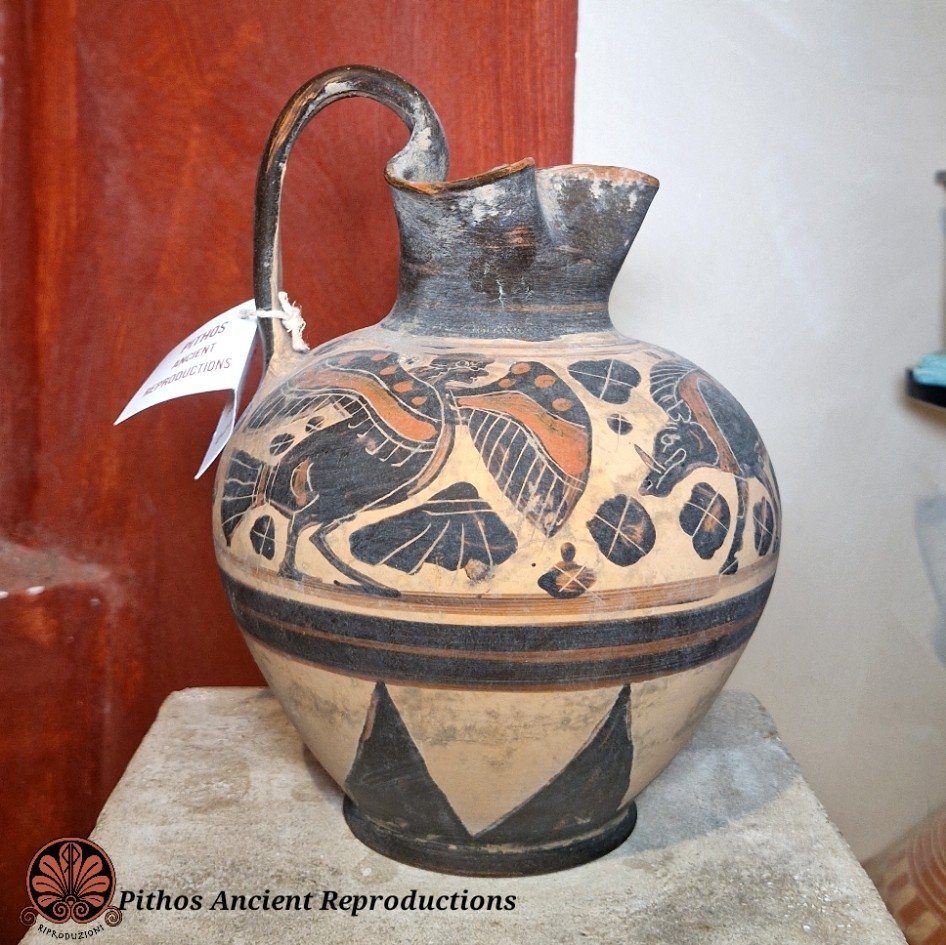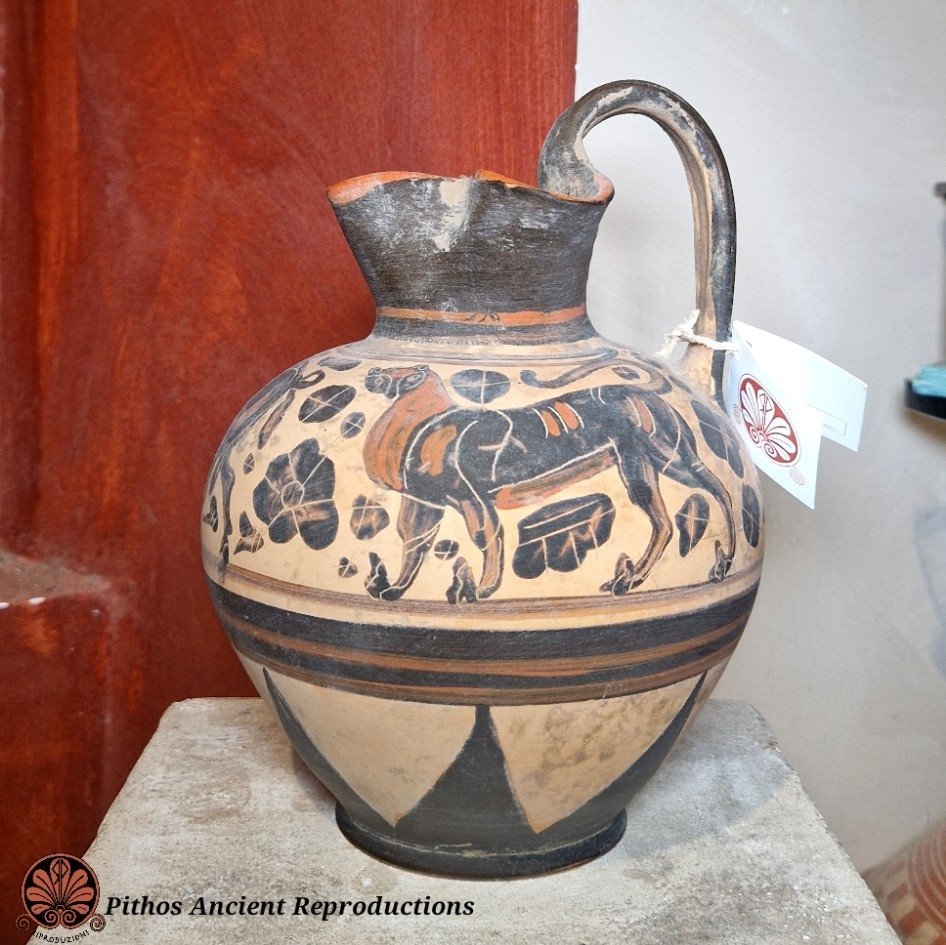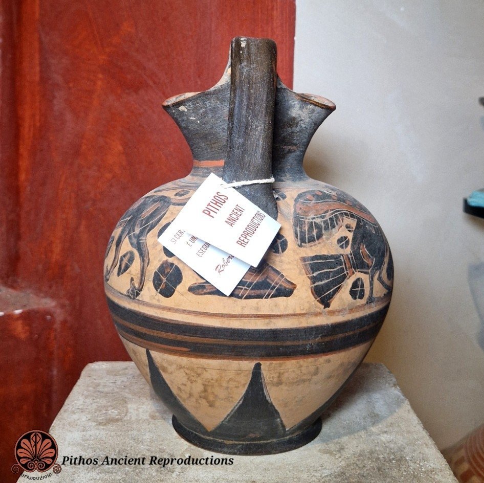 Vaso Oinochoe trilobata etrusco corinzia con figure nere. Tipiche decorazioni etrusco corinzie con una fascia di animali in sequenza, tra loro diverse decorazioni a rosetta. Realizzata con tecniche antiche e cottura in riduzione di ossigeno.