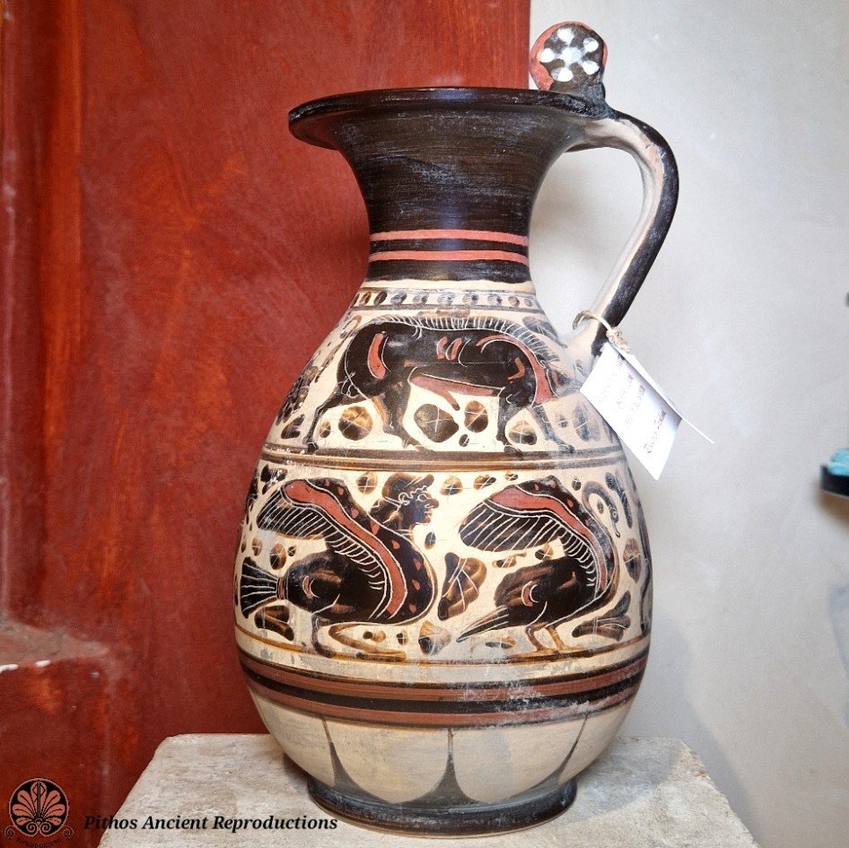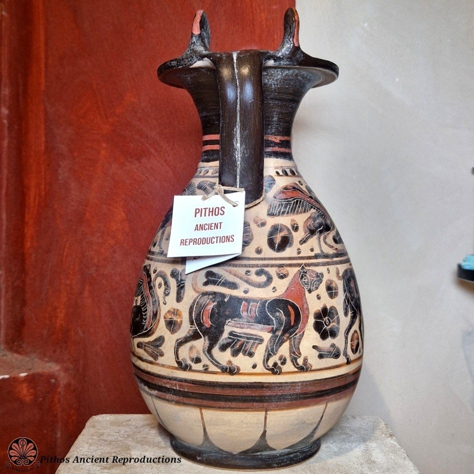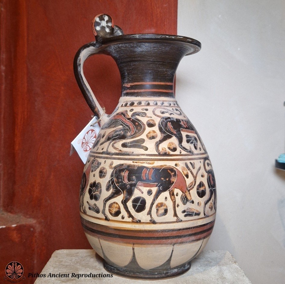 Olpe Corinzia a rotelle con figure nere. Decorata con due fasce di animali, tra loro tipiche decorazioni a rosetta.
