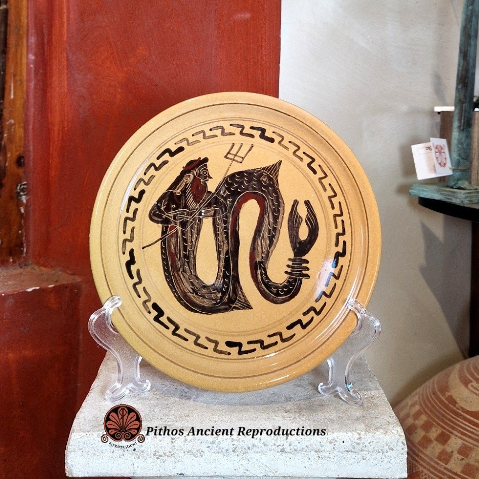 Piatto dessert moderno con decorazioni antiche a figure nere, raffigurante Tritone. Ceramica artigianale realizzata interamente a mano, smaltata per uso alimentare. Opera d'arte unica.
