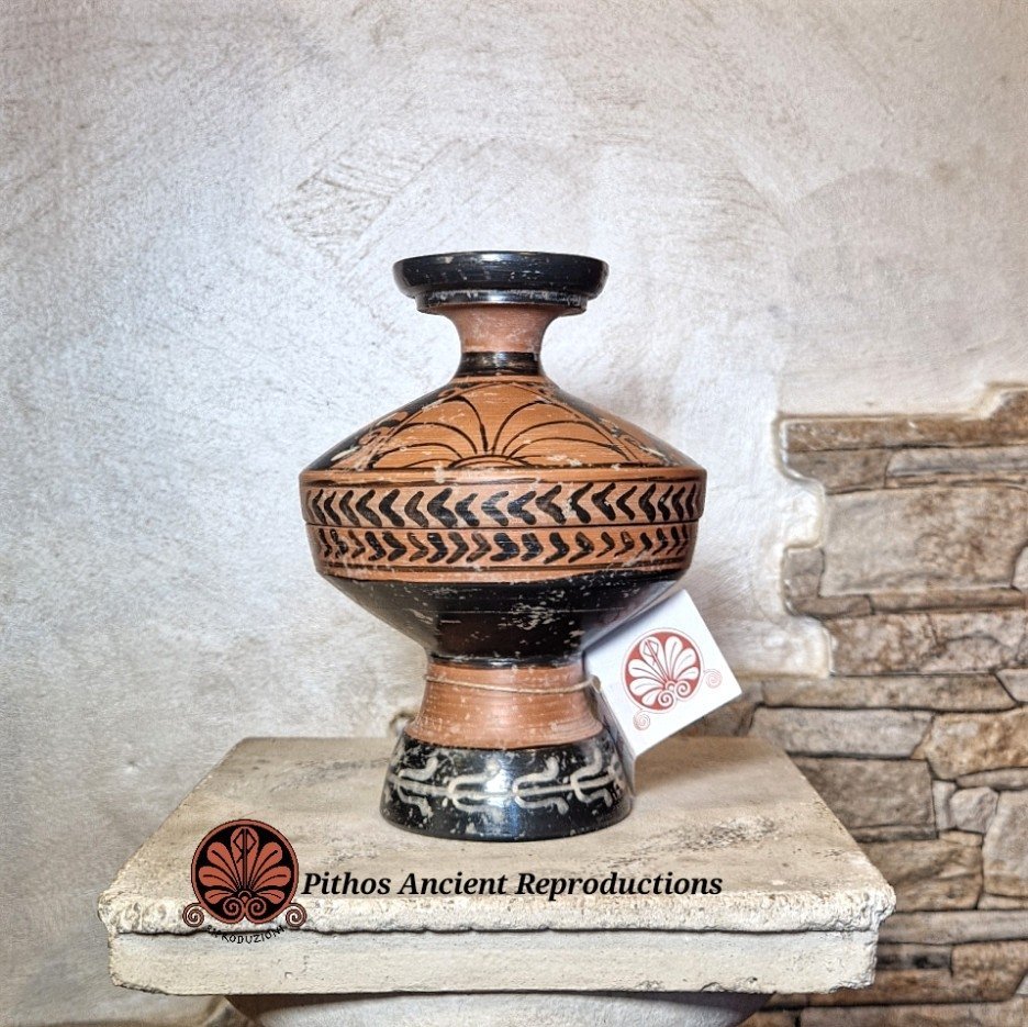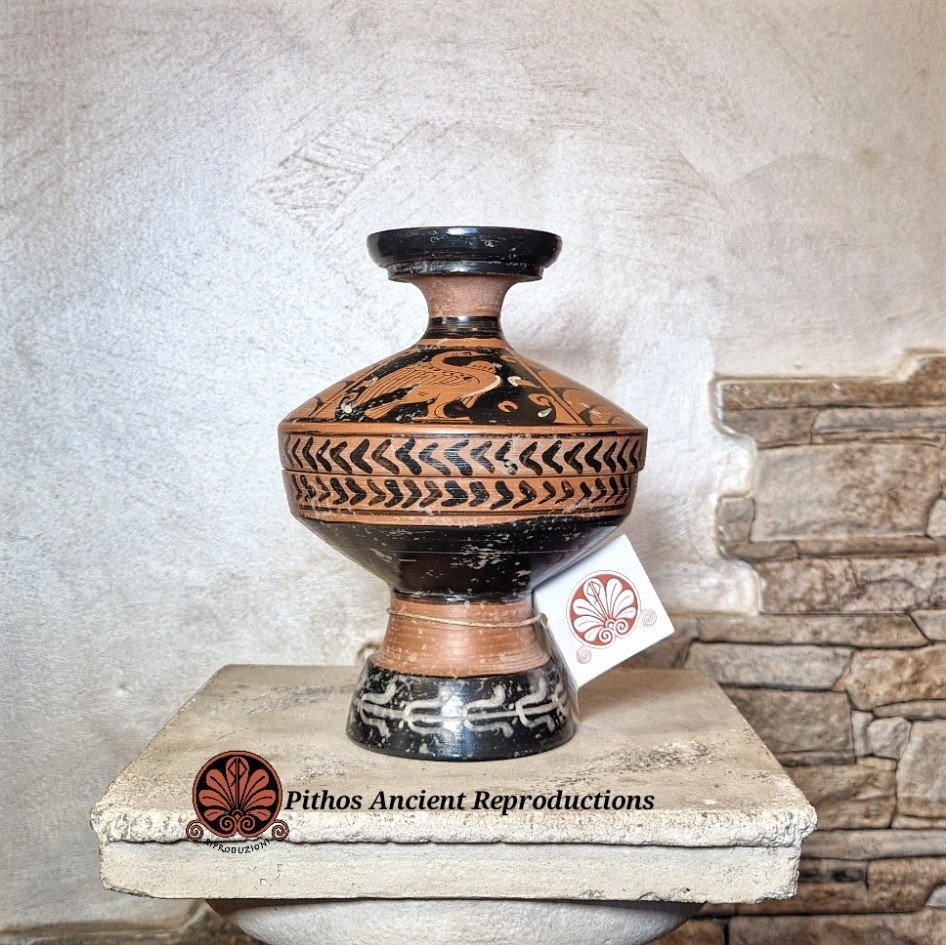 Riproduzione vaso Pisside apula con coperchio a figure rosse.
