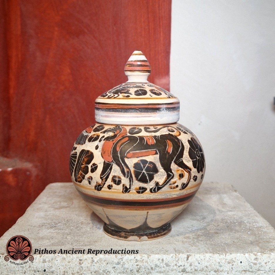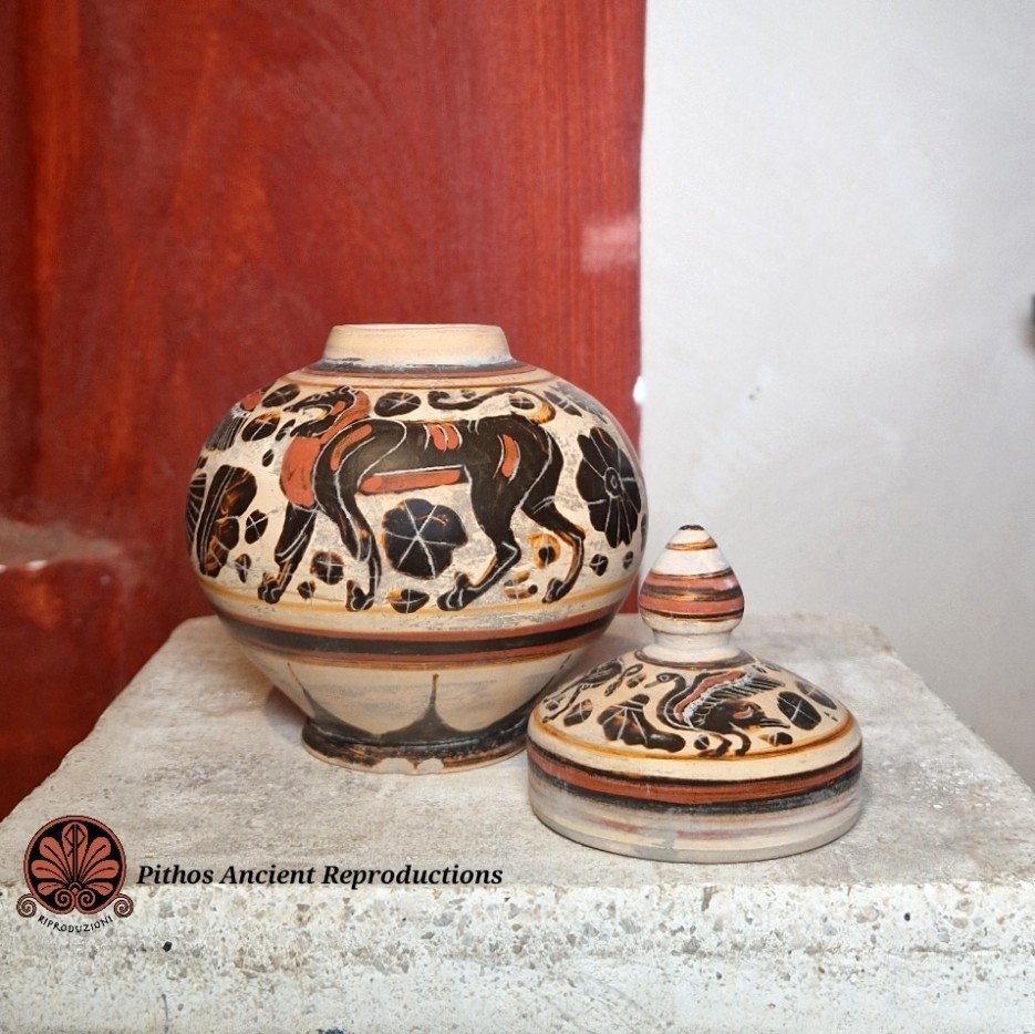 Riproduzione Pisside globulare Etrusco corinzia a figure nere con coperchio. Decorata con una scena di animali in sequenza, tra loro tipiche decorazioni a rosetta. Realizzata con le stesse tecniche utilizzate anticamente, dalla pittura alla cottura in riduzione di ossigeno.