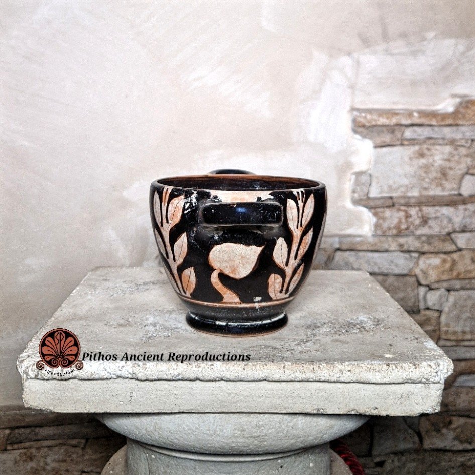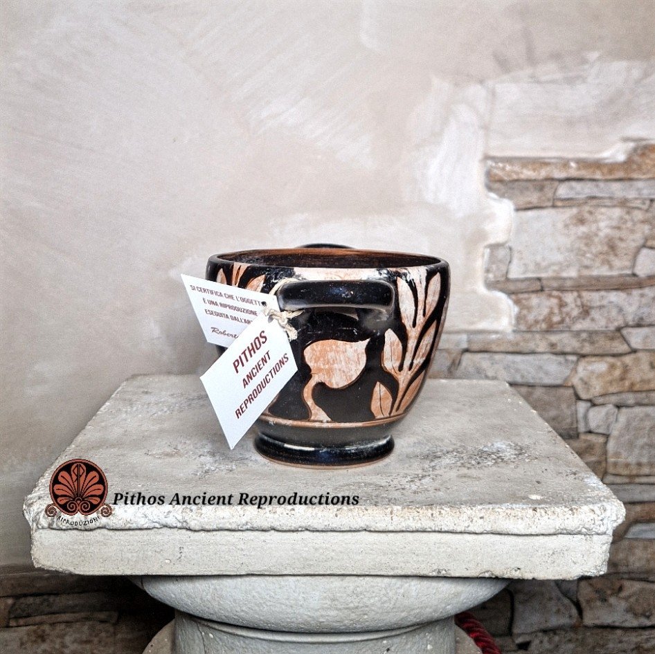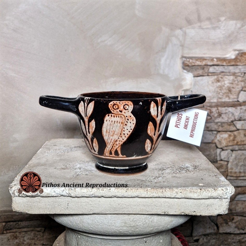 Vaso Skyphos a figure rosse, decorato su entrambi i lati, al centro con una civetta e di fianco due decorazioni con rami di olivo. Anticamente veniva utilizzato per bere vino.
