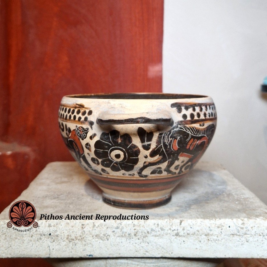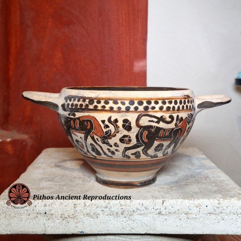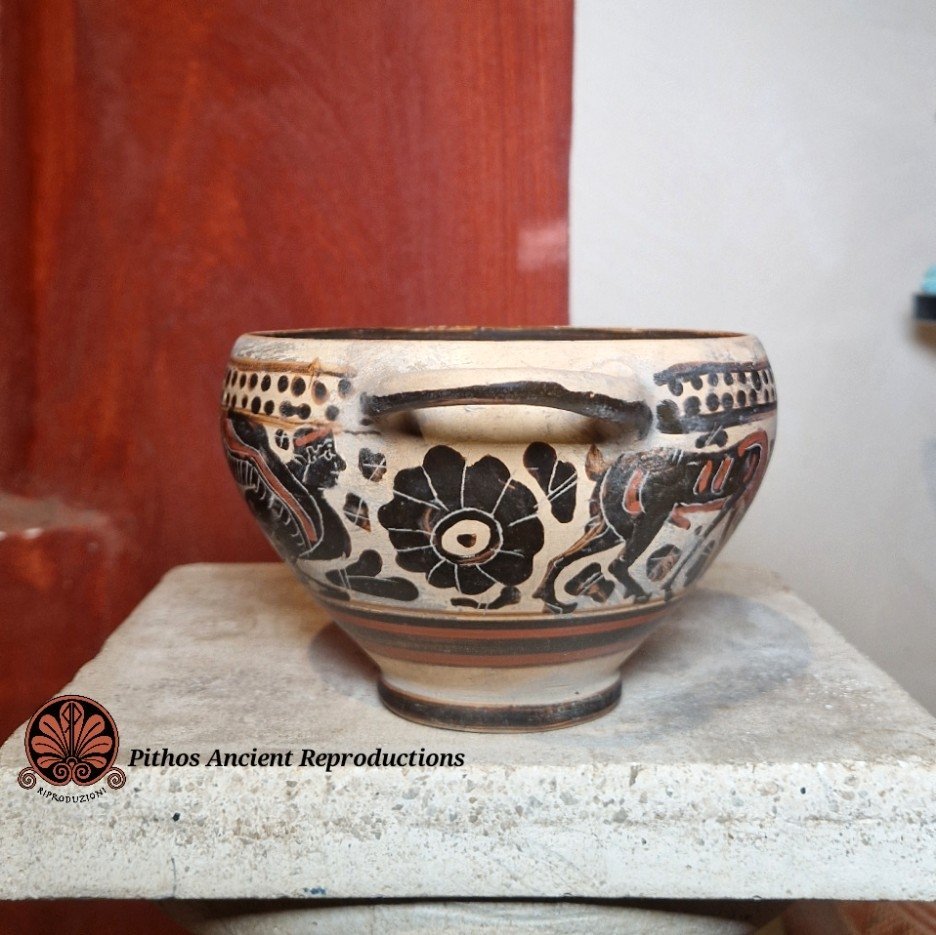 Skyphos etrusco corinzio a figure nere. Decorato su un lato con una arpia ed un cinghiale, sull' altro lato sono raffigurati una pantera ed un cervo. Tra loro tipiche decorazioni a rosetta. Realizzato con le stesse tecniche utilizzate anticamente, vernici naturali cotte in riduzione di ossigeno.