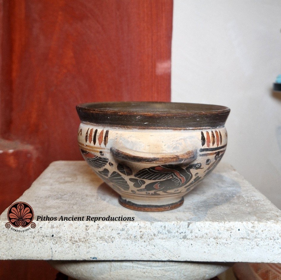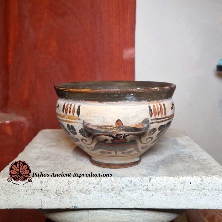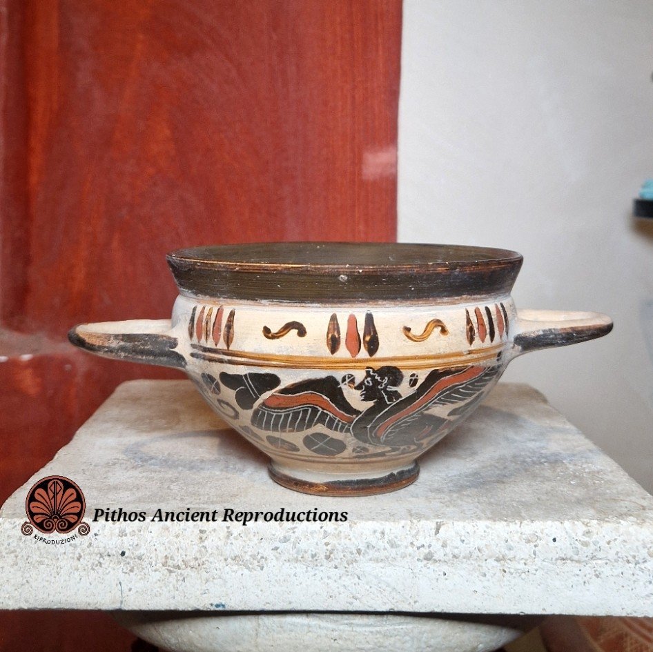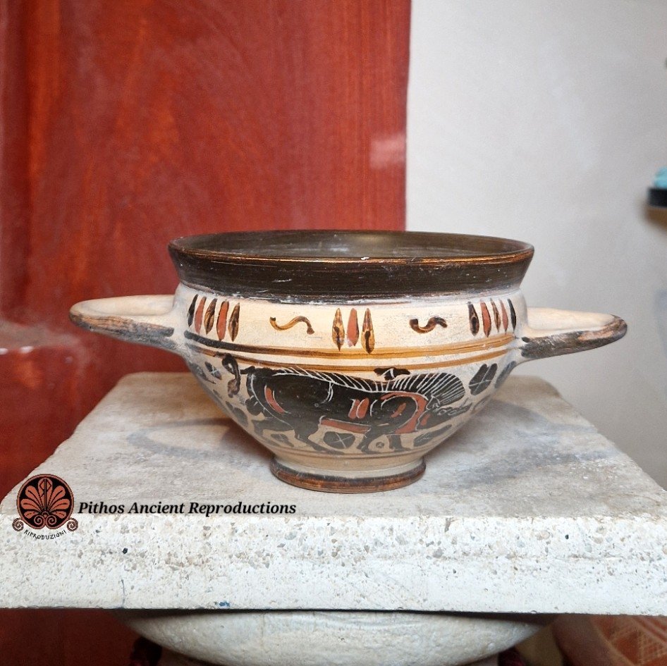 Skyphos corinzio a figure nere. Decorato su un lato con un cinghiale, sull' altro lato è raffigurata una sfinge ed un cigno. Tra loro diverse decorazioni tipiche a rosetta. Realizzato con le stesse tecniche utilizzate anticamente, pitture naturali cotte in riduzione di ossigeno.