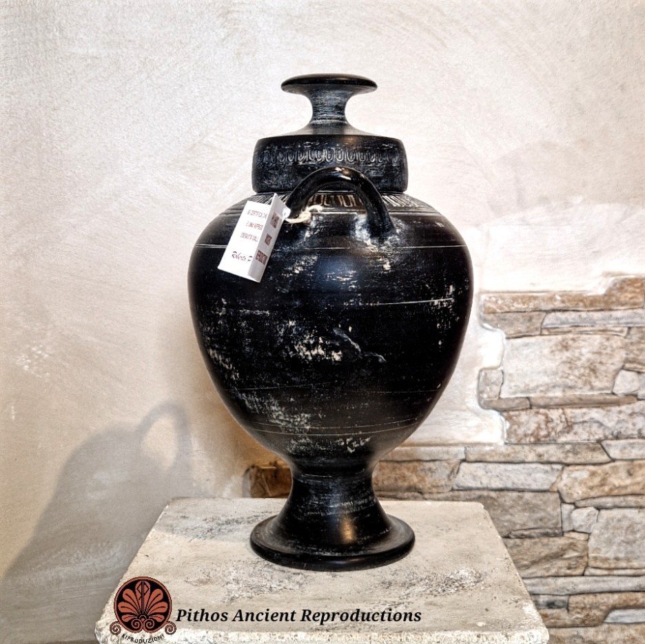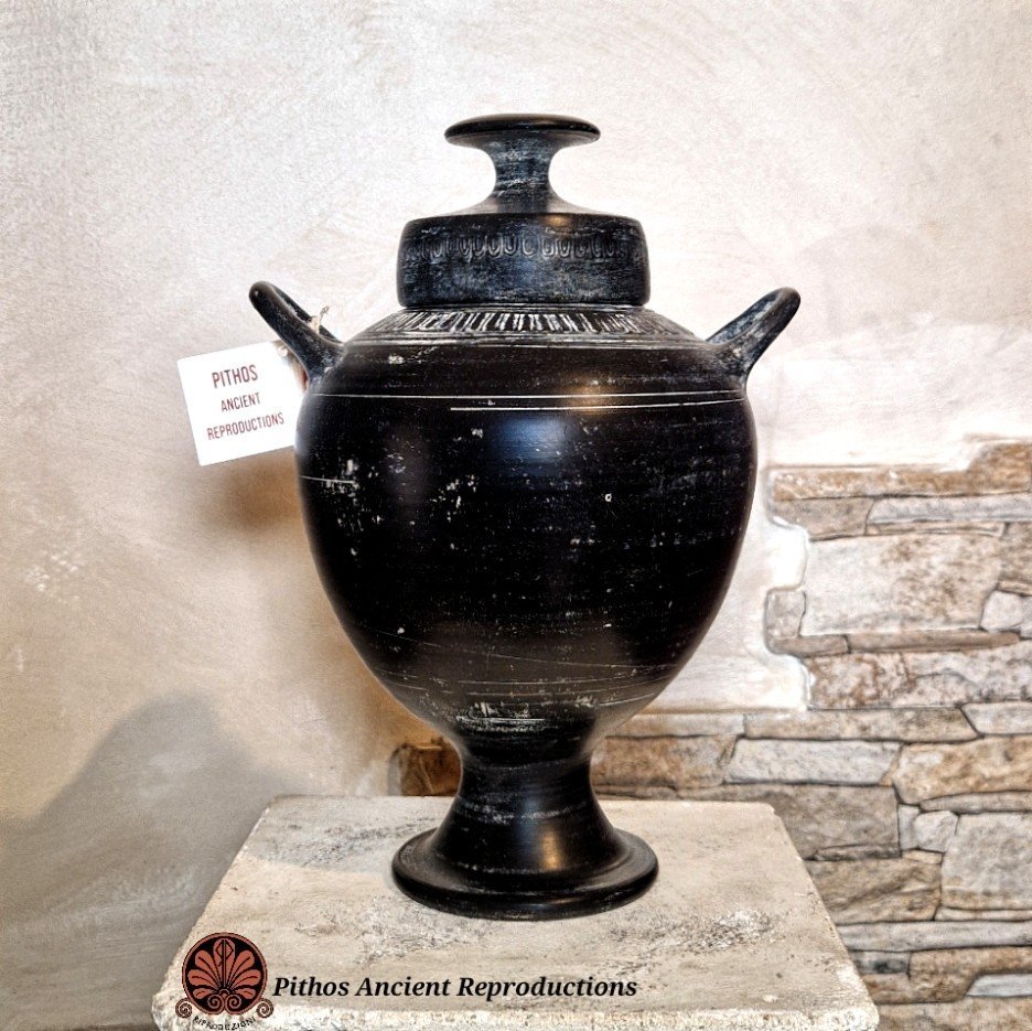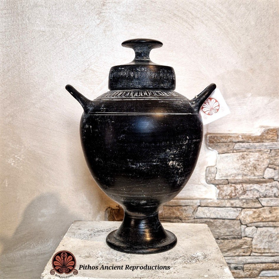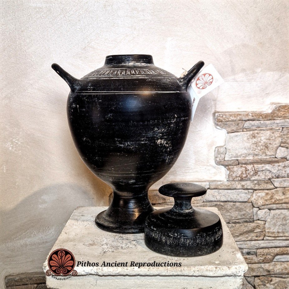 Vaso Olla globulare Etrusca in bucchero con coperchio. Anticamente veniva impiegata come contenitore funerario, ma anche per altri scopi domestici. Sulla spalla del vaso e sul bordo del coperchio è decorato un tipico meandro. Realizzata con le stesse tecniche utilizzate anticamente. Il colore nero è dato da una particolare tecnica di cottura, in totale assenza di ossigeno.