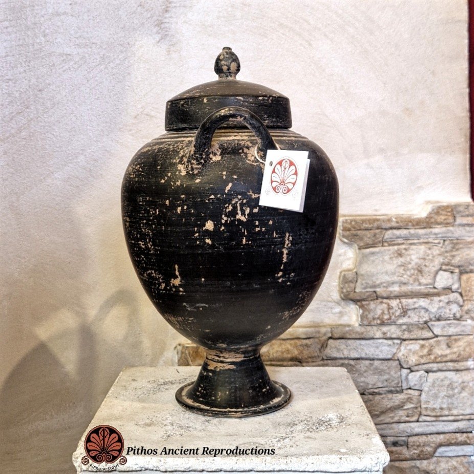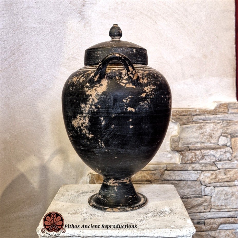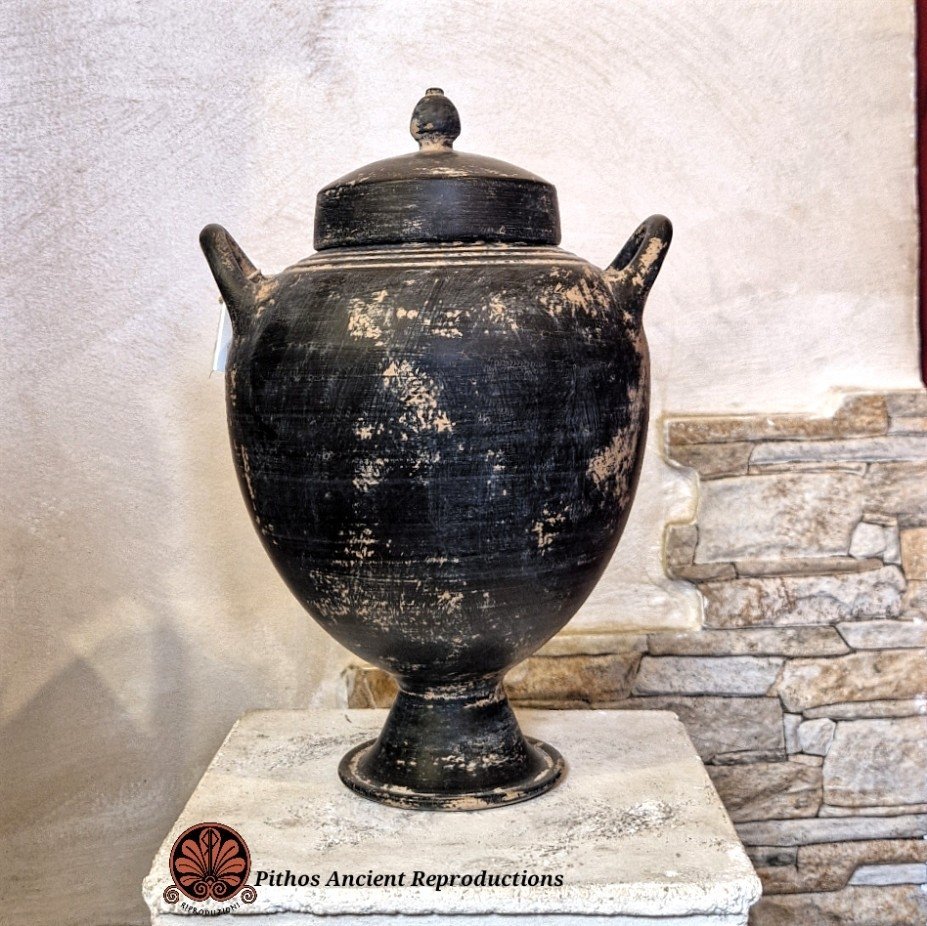Vaso Olla globulare Etrusca in bucchero con coperchio. Anticamente veniva impiegata come contenitore funerario, ma anche per altri scopi domestici. Realizzata con le stesse tecniche utilizzate anticamente. Il colore nero è dato da una particolare tecnica di cottura, in totale assenza di ossigeno.